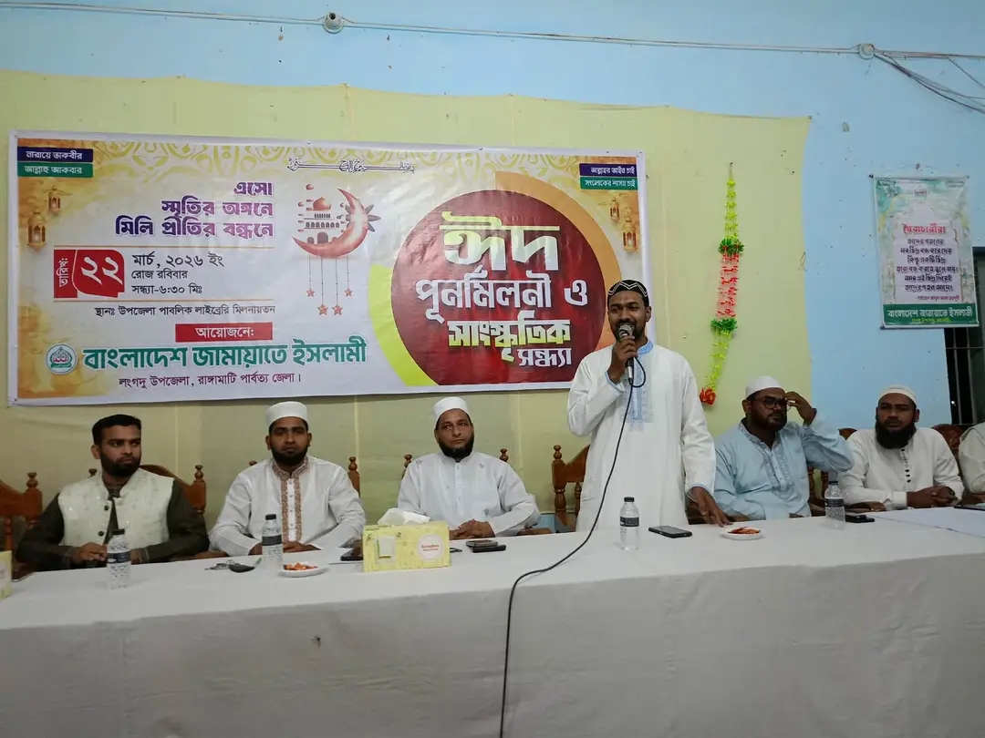 ২২ মার্চ, ২০২৬ ইং রবিবার সন্ধ্যা ৭ঃ০০ টায় উপজেলা পাবলিক লাইব্রেরি মিলনায়তনে বাংলাদেশ জামায়াতে ইসলামী রাঙ্গামাটি জেলাধীন লংগদু উপজেলার আয়োজনে ঈদ পূনর্মিলনী ও সাংস্কৃতিক সন্ধ্যা অনুষ্ঠিত হয়।