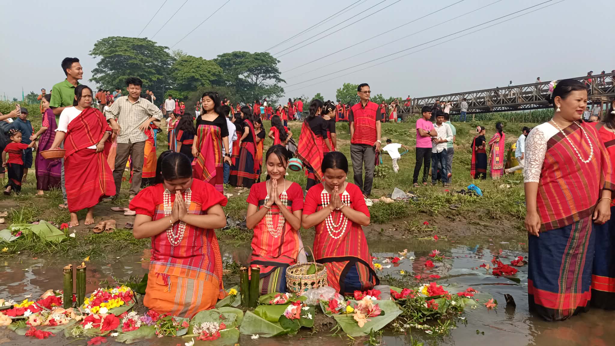 আজ রবিবার (১২-৪-২৬) ভোর ৫টা থেকে হাতে নানা রঙের ফুল নিয়ে মাইনী নদীতে আসতে থাকেন তারা। পরে নদীর জলে ফুল ভাসিয়ে পুরাতন বছরকে বিদায় ও নতুন বছরকে বরণ করে নেন।