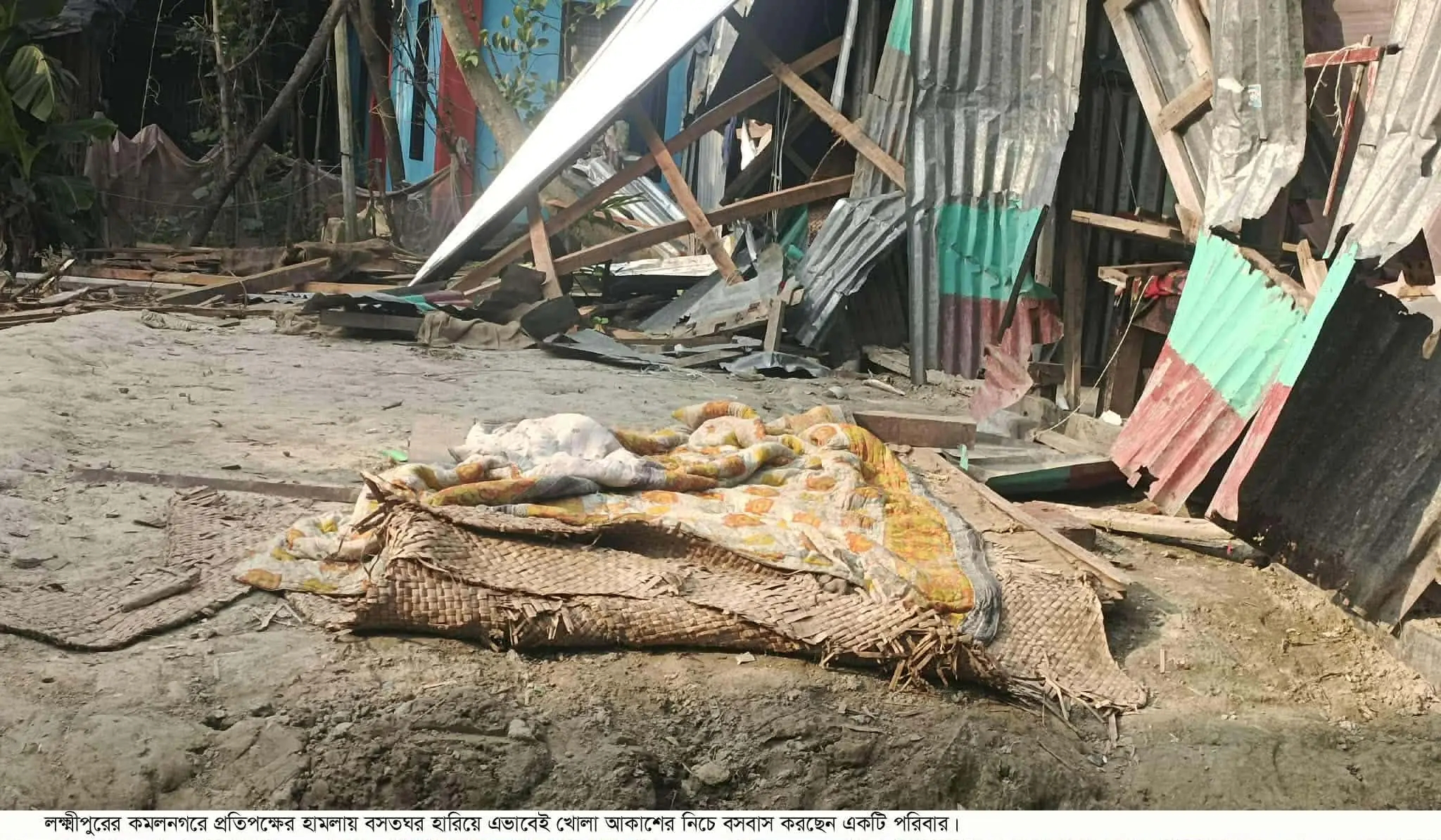 লক্ষ্মীপুরের কমলনগরে প্রতিপক্ষের হামলায় বসতঘর হারিয়ে হতদরিদ্র একটি পরিবার দুই সপ্তাহ ধরে খোলা আকাশের নিচে বসবাস করছেন বলে অভিযোগ পাওয়া গেছে। এ ঘটনায় মামলা করে আসামি পক্ষের অব্যাহত হুমকি-ধমকিতে পরিবারের সদস্যরা এখন চরম নিরাপত্তাহীনতায় রয়েছেন। এসব বিষয়ে পুলিশের সহযোগিতার পরিবর্তে উল্টো প্রভাবশালী ওই প্রতিপক্ষের দায়ের করা মামলায় নানান ধরনের হয়রানি করা হচ্ছেন তারা। বুধবার রাতে কমলনগর প্রেসক্লাবে সংবাদ সম্মেলন করে এমনই অভিযোগ করেছেন উপজেলার চরফলকন জাজিরা এলাকার বাসিন্দা নজরুল ইসলামের পরিবার। এসময় নজরুল ইসলাম ছাড়াও তার স্ত্রী রফিকেন নেছা, মেয়ে বিবি ফাতেমা, শাশুড়ি মেরাজুল বেগম, জামাতা রবিউল আলম ও ভাগিনা জহির উপস্থিত ছিলেন।