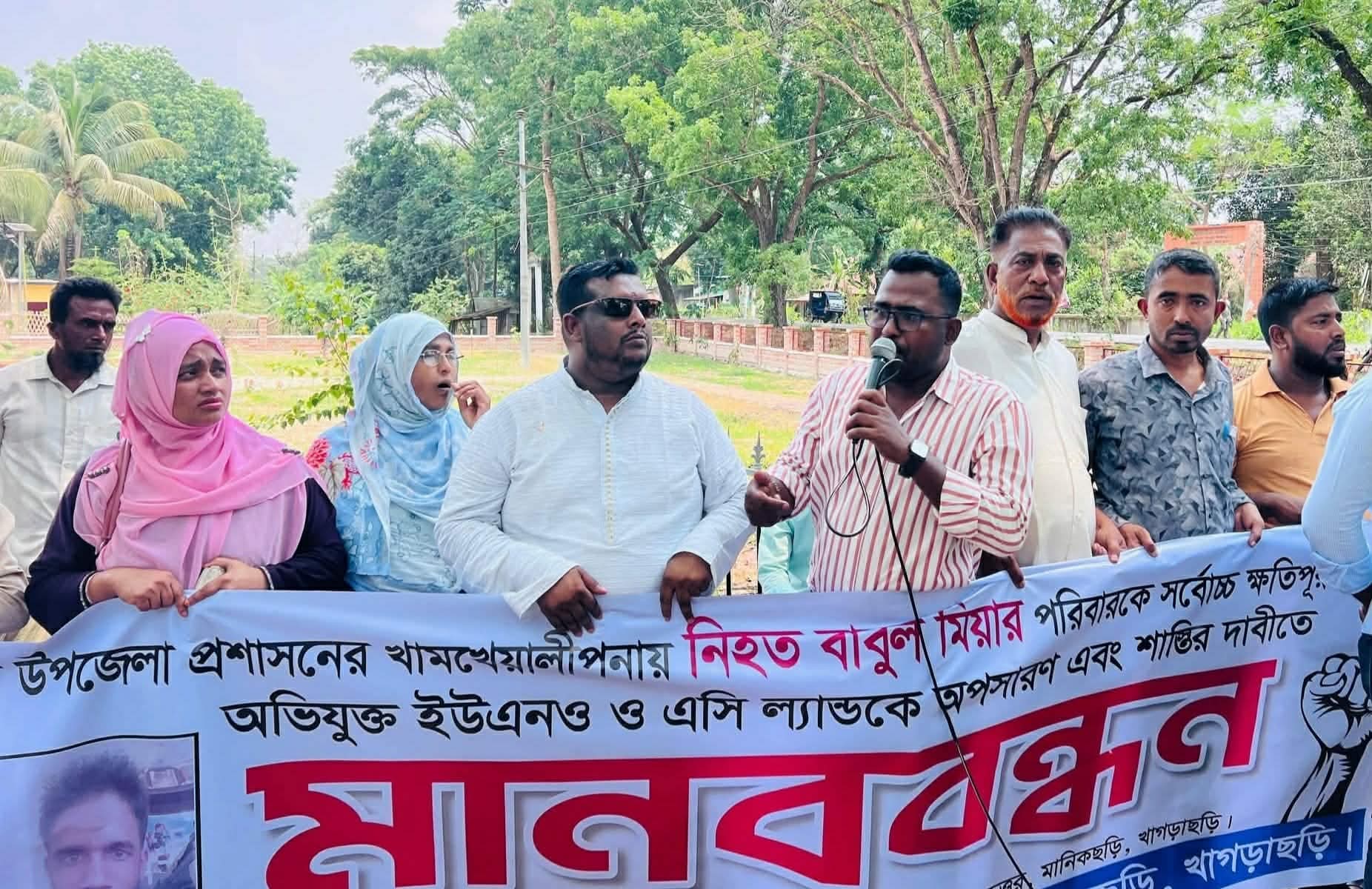 খাগড়াছড়ির মানিকছড়ি উপজেলা প্রশাসন কর্তৃক হেভিলাইসেন্স বিহীন পরিবহন শ্রমিক মো. বাবুল হোসেনকে জোরজবরদস্তি করে হুমকি ধামকির মাধ্যমে এক্সকেভটর চালাতে বাধ্য করা ও প্রশাসনের দায়িত্বহীন আচরণের অভিযোগ এনে নিহত বাবুল হোসেনের পরিবারের ন্যায্য বিচার, সর্বোচ্চ ক্ষতিপূরণ এবং ঘটনার সঙ্গে জড়িত উপজেলা নির্বাহী কর্মকর্তা (ইউএনও) ও সহকারী কমিশনার (ভূমি) এর অপসারণের দাবিতে মানিকছড়িতে মানববন্ধন শেষে স্মারকলিপি প্রদান করা করা হয়েছে। গতকাল সকালে মানিকছড়ি উপজেলা পরিষদ চত্বরে যুব সমাজ ও এলাকাবাসীর ব্যানারে অনুষ্ঠিত মানববন্ধনে স্থানীয় সচেতন নাগরিক, বিভিন্ন পরিবহন শ্রমিক সংগঠনের নেতৃবৃন্দ, বিভিন্ন সামাজিক, রাজনৈতিক ও স্বেচ্ছাসেবী সংগঠনের নেতৃবৃন্দ, পাহাড়ি-বাঙালি সম্প্রদায়ের নেতৃবৃন্দ এবং সর্বস্তরের সাধারণ জনগণ অংশগ্রহণ করেন। মানববন্ধনে অংশগ্রহণকারীরা ব্যানার ও প্ল্যাকার্ড প্রদর্শন করে তাদের দাবির প্রতি সংহতি প্রকাশ করেন।
