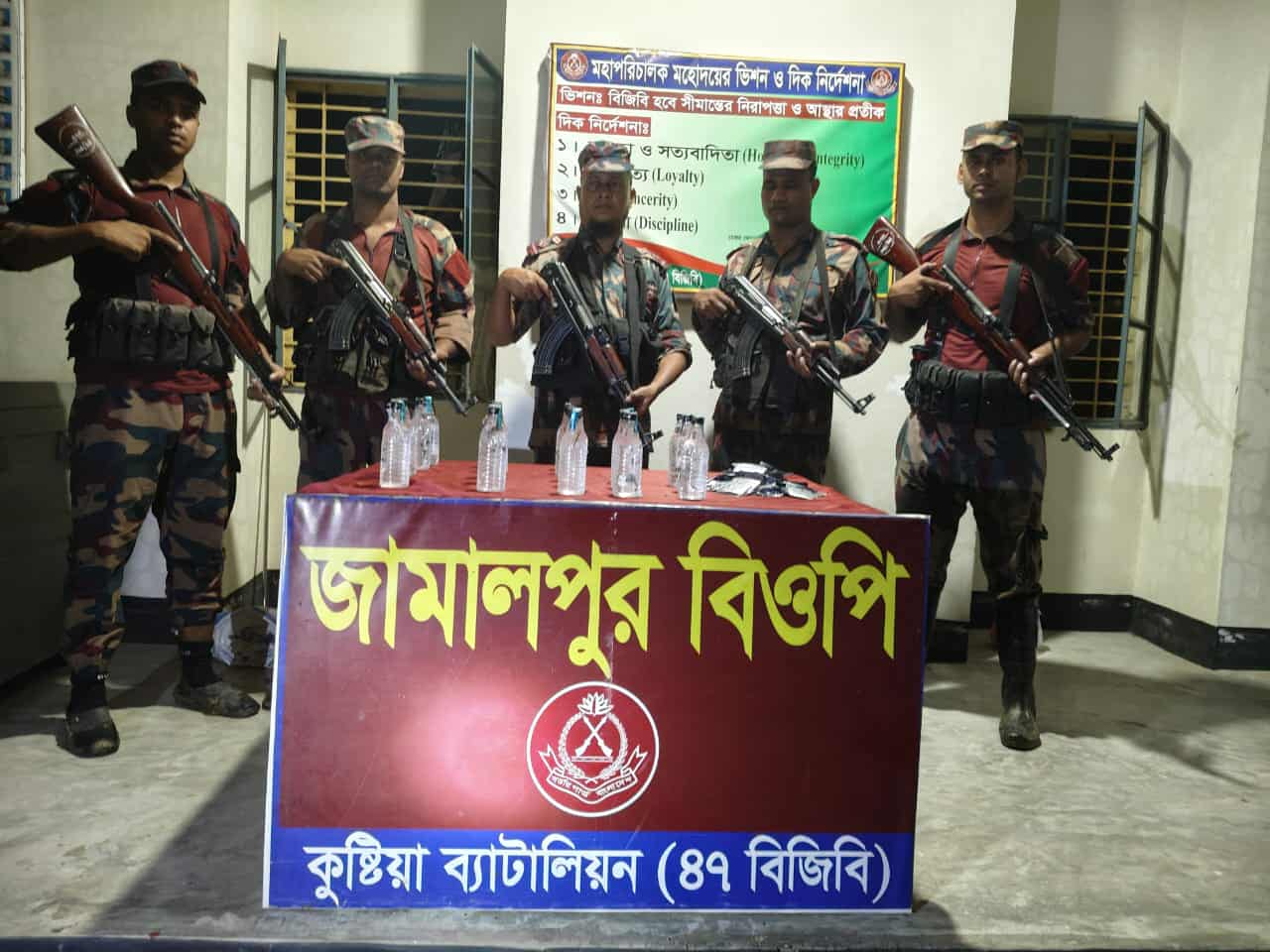 কুষ্টিয়ায় সীমান্তে বিজিবির মাদক বিরোধী পৃথক অভিযানে ৪৪ বোতল ভারতীয় মদ ও ৩শ' পিস সিলডিনাফিল ট্যাবলেট উদ্ধার করেছে। বৃহস্পতিবার ভোরে কুষ্টিয়া ব্যাটালিয়নের (৪৭ বিজিবি) অধীনস্থ জামালপুর বিওপির নায়েব সুবেদার খোরশেদ আলমের নেতৃত্ব জেলার দৌলতপুর উপজেলার জামালপুর মাঠে মাদক ও চোরাচালান বিরোধী অভিযান চালিয়ে ২৩ বোতল ভারতীয় মদ ও ৩শ' পিস সিলডিনাফিল ট্যাবলেট উদ্ধার করে। অন্যদিকে পশ্চিম ধর্মদাহ বিওপি’র নায়েব সুবেদার কাইয়ুম হোসেনের পশ্চিম ধর্মদাহ মাঠে অভিযান চালিয়ে ২১ বোতল ভারতীয় মদ উদ্ধার করে। ৪৭ বিজিবির অধিনায়ক লেঃ কর্নেল মাহবুব মুর্শেদ রহমান ঘটনার সত্যতা নিশ্চিত করে বলেন আটকৃত মালামালের সিজার মূল্য ১ লক্ষ ৫৬ হাজার টাকা। উদ্ধারকৃত মাদকদ্রব্য ধ্বংসের নিমিত্তে ব্যাটালিয়নের মাদক স্টোরে জমা করা রয়েছে।