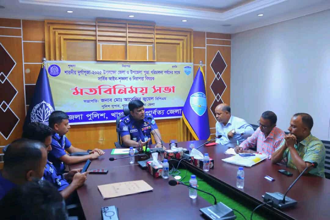 সোমবার ১৫ সেপ্টেম্বর সকালে খাগড়াছড়ি জেলা পুলিশের আয়োজনে পুলিশ সুপার সম্মেলন কক্ষে আসন্ন শারদীয় দূর্গাপূজা-২০২৫ উদযাপন উপলক্ষ্যে জেলার সকল পূজামন্ডপ সমূহের সার্বিক নিরাপত্তা ও আইন শৃঙ্খলা পরিস্থিতি নিয়ন্ত্রণ সংক্রান্ত মতবিনিময় সভায় সভাপতিত্ব করেন জেলা পুলিশ সুপার মোঃ আরেফিন জুয়েল।