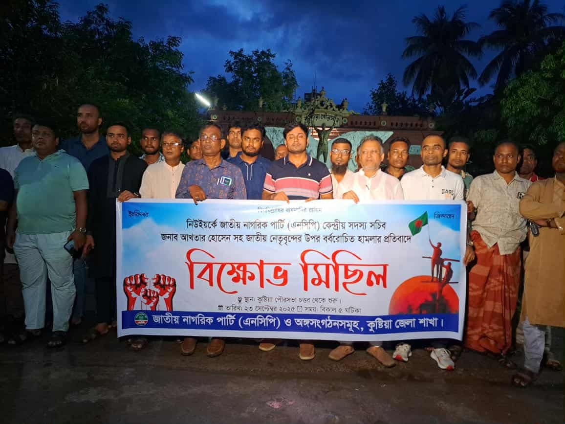 যুক্তরাষ্ট্রের নিউইয়র্কে জাতীয় নাগরিক পার্টি (এনসিপি)'র সদস্য সচিব আখতার হোসেনসহ রাজনীতিবিদদের ওপর হামলার প্রতিবাদে কুষ্টিয়ায় বিক্ষোভ মিছিল করেছে দলটির নেতাকর্মীরা। কেন্দ্রীয় কর্মসূচির অংশ হিসেবে মঙ্গলবার সন্ধ্যায় কুষ্টিয়া পৌর চত্বর থেকে মিছিলটি শুরু হয়ে শহরের প্রধান প্রধান সড়ক প্রদক্ষিণ করে পুনরায় পৌর চত্বরে গিয়ে শেষ হয়। পরে সেখানে সংক্ষিপ্ত সমাবেশে এনসিপির জেলা শাখার প্রধান সমন্বয়কারী জান্নাতুল ফেরদৌস টনির সভাপতিত্বে বক্তব্য রাখেন দলটির কেন্দ্রীয় সংগঠক কুষ্টিয়া-২ (মিরপুর-ভেড়ামারা) আসনের এমপি পদপ্রার্থী নয়ন আহমেদ, জেলা শাখার যুগ্ম সমন্বয়কারী সাজ্জাদুর রহমান বিপুল, আলমাস হাসান মামুন, বুলবুল আহমেদ প্রমুখ।
