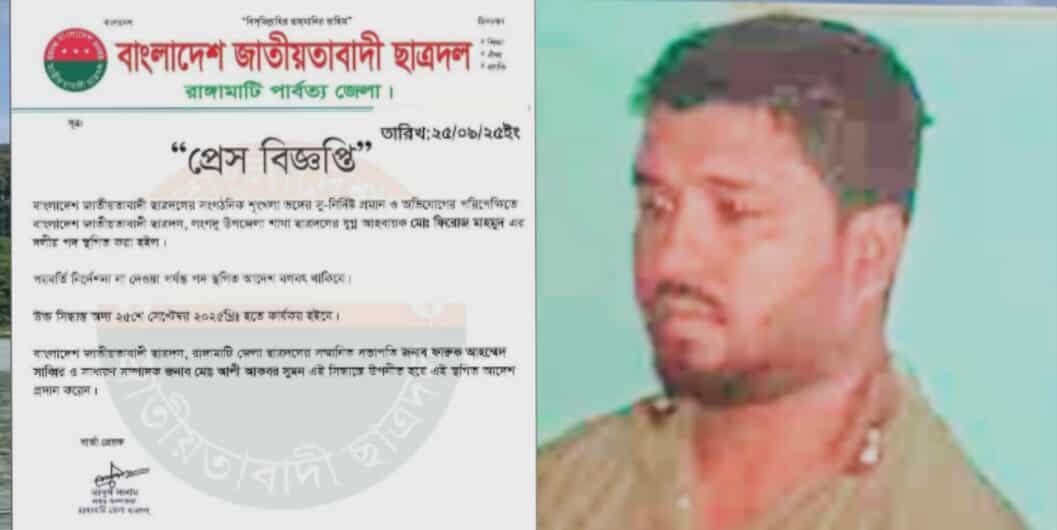 প্রেস বিজ্ঞপ্তিতে বলা হয়, বাংলাদেশ জাতীয়তাবাদী ছাত্র দলের দলীয় আদর্শ ও শৃঙ্খলা ভঙ্গের সুনির্দিষ্ট অভিযোগের ভিত্তিতে তাকে তার লংগদু উপজেলা ছাত্র দলের যুগ্ম আহবায়ক পদ পরবর্তী নির্দেশনা না দেয়া পর্যন্ত স্থগিত করা হয়।