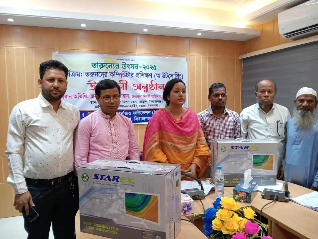 সিরাজগঞ্জের তাড়াশে আউটসোর্সিং পদ্বতিতে আর্থিক স্বাবলম্বি হওয়ার লক্ষ্যে তরুন-তরুণীদের বিনামূল্যে কম্পিউটার প্রশিক্ষণের উদ্বোধন করা হয়েছে।মঙ্গলবার উপজেলা পরিষদ মিলনায়তনে বাংলাদেশ এনজিও ফাউন্ডেশনের অর্থায়নে সোস্যাল ডেভেলপমেন্ট ফাউন্ডেশন (এসডিএফ)’র বাস্তবায়নে ওই কম্পিউটার প্রশিক্ষণের উদ্বোধন করা হয়।তাড়াশ প্রেসক্লাব সভাপতি অধ্যাপক সাব্বির আহম্মেদের সভাপতিত্বে উদ্বোধনী অনুষ্ঠানে প্রধান অতিথি হিসেবে উপস্থিত ছিলেন উপজেলা নির্বাহী কর্মকর্তা নুসরাত জাহান। স্বাগত বক্তব্য রাখেন, এসডিএফ-এর পরিচালক হাবিবুর রহমান। অন্যান্যদের মধ্যে উপস্থিত ছিলেন, প্রকল্পের প্রশিক্ষক হুমায়ুন কবির লিমন, কর্মসূচি সুপার ভাইজার রেখা খাতুন, সংস্থার কার্যকরী সদস্য এম এইচ খাঁন প্রমূখ। উল্লেখ্য, উক্ত কর্মসূচির আওতায় ৪০ জন তরুণ-তরুণীকে বিনামূল্যে কম্পিউটার প্রশিক্ষণ প্রদান করা হবে।
