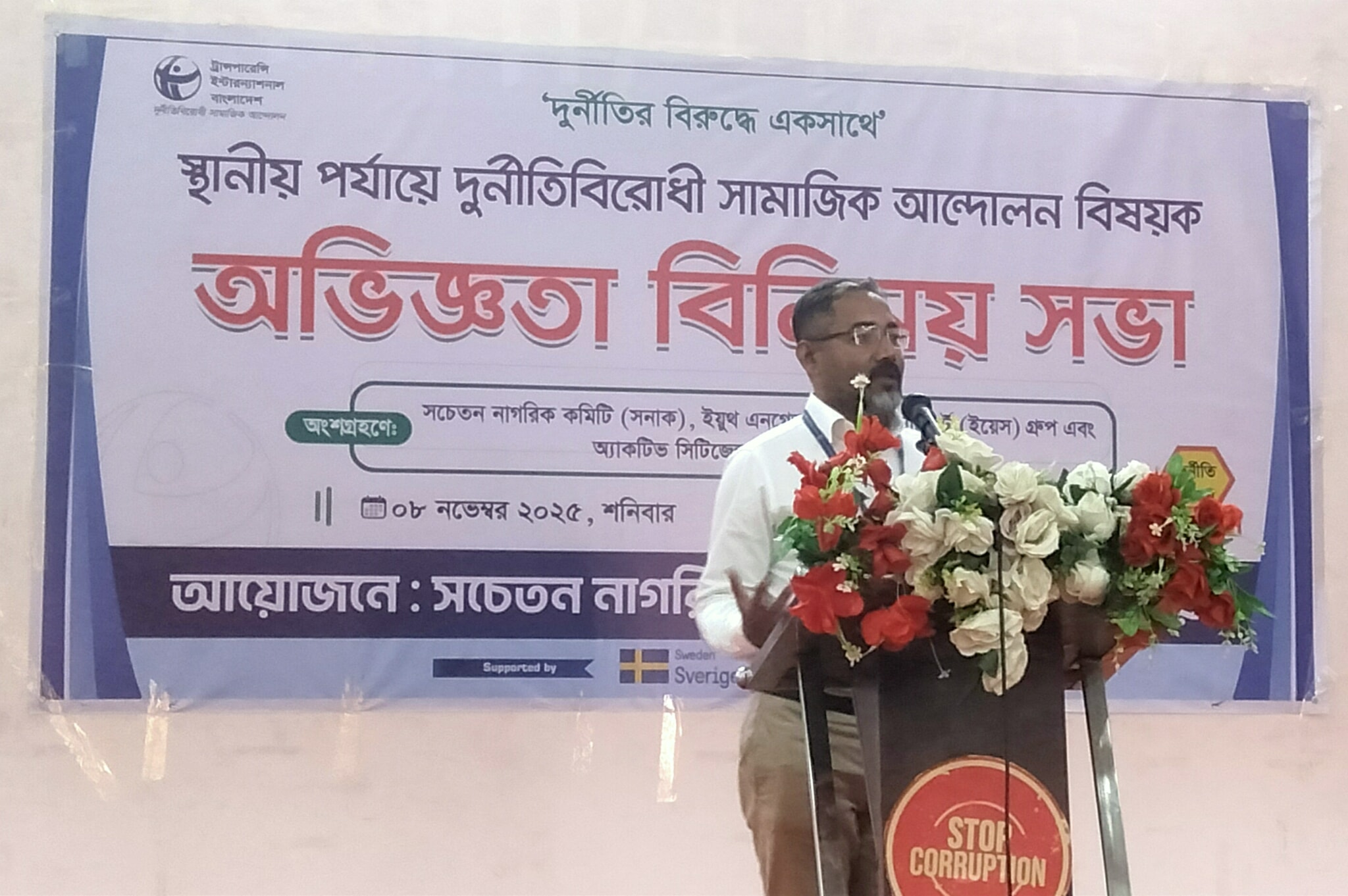 কুষ্টিয়ায় স্থানীয় পর্যায়ে দুর্নীতিবিরোধী সামাজিক আন্দোলন বিষয়ক অভিজ্ঞতা বিনিময় সভা অনুষ্ঠিত হয়েছে। সচেতন নাগরিক কমিটি (সনাক) ও ট্রান্সপারেন্সি ইন্টারন্যাশনাল বাংলাদেশ (টিআইবি)'র যৌথ উদ্যোগে শনিবার সকালে শিল্পকলা একাডেমিতে এ মতবিনিময় সভা অনুষ্ঠিত হয়। সনাকের সভাপতি আসমা আনসারী মিরুর সভাপতিত্বে অনুষ্ঠানে দুর্নীতিবিরোধী শপথ বাক্য পাঠ করান সনাক সদস্য অশোক সাহা। বক্তব্য রাখেন টিআইবির সমন্বয়কারী কাজী শফিকুর রহমান, খুলনা ক্লাস্টারের সমন্বয়কারী ফিরোজ উদ্দিন, সনাকের সদস্য রফিকুল আলম টুকু, ড. সরোয়ার মোর্শেদ, নীলিমা বিশ্বাস, হালিমা খাতুন, নজরুল ইসলাম, মিজানুর রহমান লাকি, তারিকুল হক তারিক প্রমুখ। শুভেচ্ছা বক্তব্য রাখেন সনাকের সহ-সভাপতি শাহজাহান আলী। দুর্নীতি বিরোধী আন্দোলনের অভিজ্ঞতা অর্জন ও প্রতিবন্ধকতা সমূহ পাওয়ার পয়েন্টের মাধ্যমে উপস্থাপন করেন টিআইবির এরিয়া কো-অর্ডিনেটর রায়হানুল ইসলাম। অনুষ্ঠানটি পরিচালনা করেন ইয়ুথ এনগেজমেন্ট সাপোর্ট গ্রুপের সদস্য সুমাইয়া খাতুন ও অ্যাকটিভ সিটিজেন্স গ্রুপের সদস্য ইমাম মেহেদী। এতে সনাক, ইয়েস ও এসিজির সদস্যরা অংশ নেন। সভায বক্তারা বলেন বৈষম্যমুক্ত সমাজ ও দেশ গঠনে দুর্নীতি প্রধান অন্তরায়। এটি অর্থনৈতিক প্রবৃদ্ধি, সুশাসন এবং সামাজিক ন্যায়বিচারকে ব্যাহত করে। তাই দুর্নীতির বিরুদ্ধে সামাজিক আন্দোলন গড়ে তুলতে হবে। উন্নয়নকে ত্বরান্বিত করতে দুর্নীতিমুক্ত দেশ গঠনের বিকল্প নেই। বিকেলে এক মনোজ্ঞ সাংস্কৃতিক অনুষ্ঠান অনুষ্ঠিত হয়।