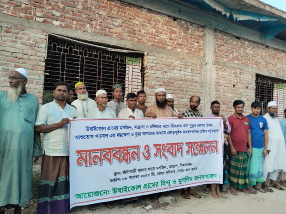 তাড়াশে ধর্মীয় প্রতিষ্ঠানের পুকুর দখলচেষ্টার প্রতিবাদে হিন্দু-মুসলিমদের সম্মিলিত মানববন্ধন