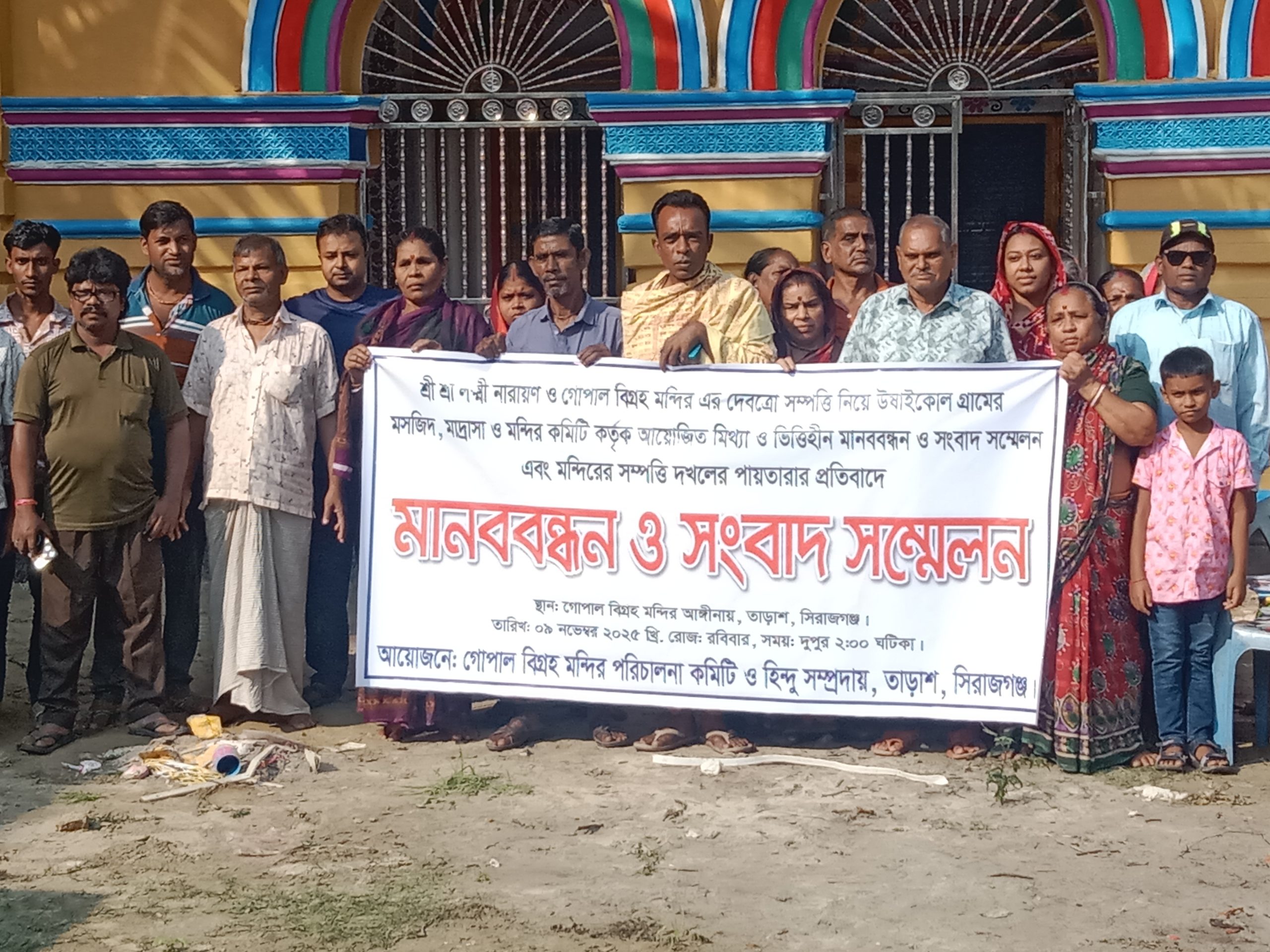সিরাজগঞ্জের তাড়াশ উপজেলায় ঐতিহ্যবাহী শ্রী শ্রী লক্ষ্মী নারায়ণ ও গোপাল বিগ্রহ মন্দিরের সম্পত্তি জোরপূর্বক দখলের চেষ্টা এবং মন্দির কমিটির সদস্যদের বিরুদ্ধে মিথ্যা অভিযোগের প্রতিবাদে মানববন্ধন ও সংবাদ সম্মেলন অনুষ্ঠিত হয়েছে। রবিবার(৯ নভেম্বর) মন্দির প্রাঙ্গণে এই কর্মসূচির আয়োজন করে মন্দির কমিটি এবং স্থানীয় হিন্দু সম্প্রদায়ের সদস্যরা।