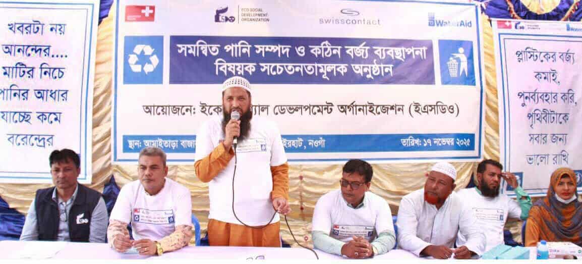 নওগাঁর ধামইরহাটে পৌর এলাকায় সমন্বিত পানি সম্পদ ও কঠিন বর্জ্য ব্যবস্থাপনা বিষয়ে সচেতনতামুলক বাজার ক্যাম্পেইন অনুষ্ঠিত হয়েছে। ১৭ নভেম্বর (সোমবার) ইকো-সোশ্যাল ডেভলপমেন্ট অর্গানাইজেশন (ইএসডিও)-র গোফরইমপ্যাক্ট কর্মসূচির আয়োজনে, সুইজারল্যান্ড সরকারের অর্থায়নে এবং ওয়াটারএইড বাংলাদেশ ও সুইসকন্টাক্ট বাংলাদেশের সহযোগিতায় ধামইরহাট পৌরসভার আমাইতাড়া বাজারে সম্বনিত পানি সম্পদ ও কঠিন বর্জ্য ব্যবস্থাপনা বিষয়ক সচেতনতামূলক বাজার ক্যাম্পেইন অনুষ্ঠিত হয়। উক্ত ক্যাম্পেইনে র্যালী, পরিচ্ছন্নতা অভিযান, আলোচনা অনুষ্ঠান ও সেরা পরিস্কার-পরিচ্ছন্ন ব্যবসায়ী নির্বাচন করে তাদেরকে পুরস্কার প্রদান করা হয়। অনুষ্ঠানে অংশগ্রহন করেন আমাইতাড়া বাজার বণিক সমিতির সভাপদি মোঃ হানজালা, সহ-সভাপতি মো. আনোয়ারুল ইসলাম, জেলা যুবদলের আহবায়ক কমিটির সদস্য ও উপজেলা যুব দলের যুগ্ম আহবায়ক মো. জাহাঙ্গীর আলম লিটন, পৌর স্যানিটারী ইন্সপেক্টর মোঃ মোস্তাফিজার রহমানসহ আমাইতাড়া বাজারের সকল ব্যবসায়ী, বাজার কমিটির নেতৃবৃন্দ, পৌরসভার প্রতিনিধি, এলাকার সকল স্তরের জনগণসহ সমাজের গণ্যমান্য ব্যক্তিবর্গ এবং ইএসডিও গোফরইমপ্যাক্ট প্রকল্পের কর্মীবৃন্দ।