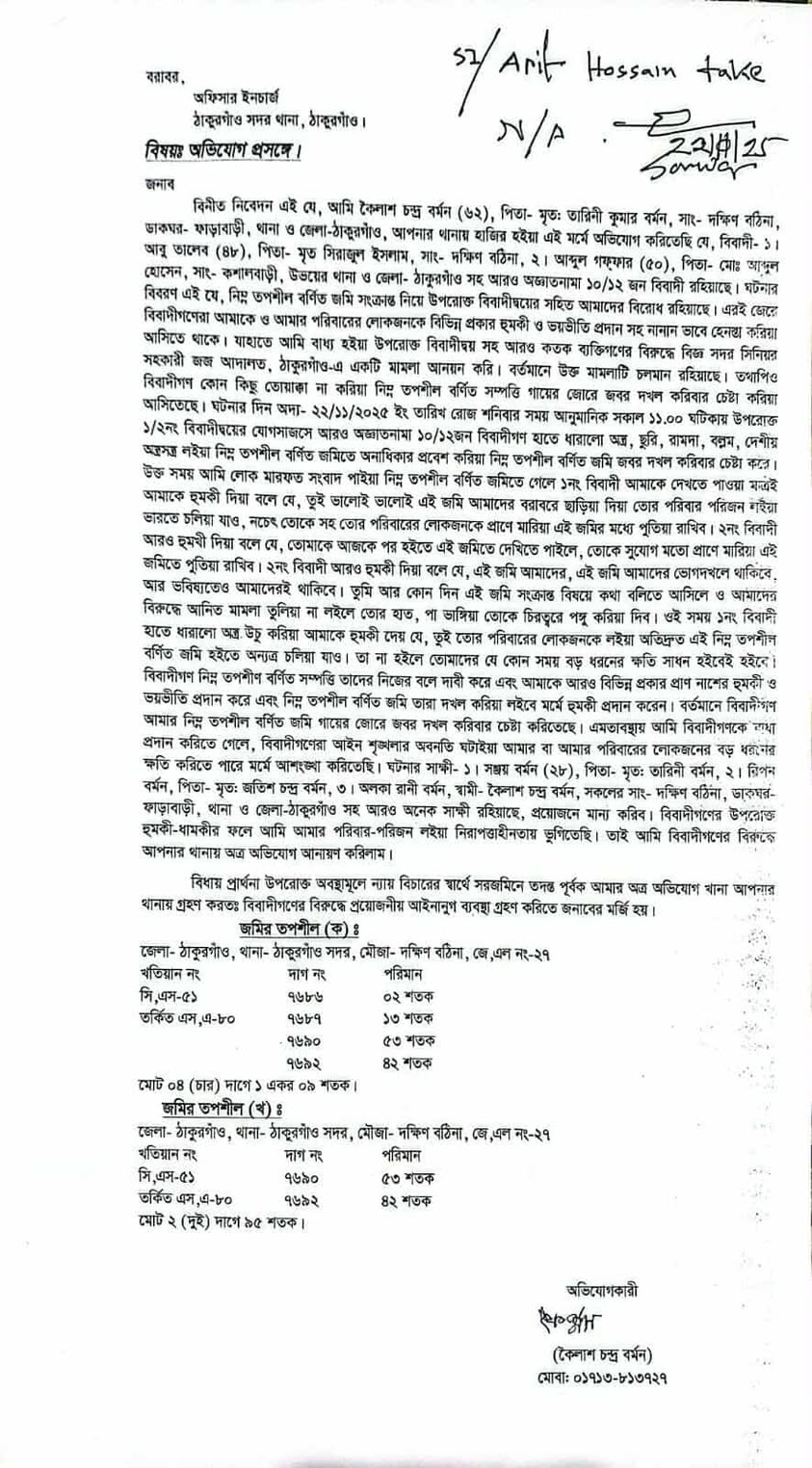 অভিযোগ সূত্রে জানা যায়, ভুক্তভোগী কৈলাশ চন্দ্র বর্মনের সঙ্গে একই এলাকার ইউনিয়ন বিএনপির সাবেক সাধারণ সম্পাদক (বহিষ্কৃত) আবু তালেব (৪৮), আব্দুল গফ্ফার (৫০) সহ আরও কয়েকজনের সঙ্গে দীর্ঘদিন ধরে জমি নিয়ে বিরোধ চলছে। বিষয়টি নিয়ে কৈলাশ আদালতে মামলা দায়ের করেন যা ঠাকুরগাঁও বিজ্ঞ সদর সিনিয়র সহকারী জজ আদালতে বিচারাধীন।