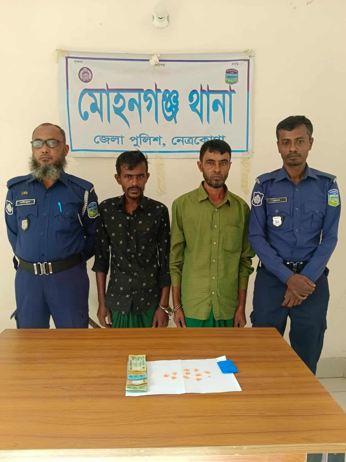 পুলিশ সূত্রে জানা গেছে, পৌর শহরের নওহাল এলাকার আব্দুল বারেকের ছেলে হিমেল মিয়া ও টেঙ্গাপাড়া এলাকার আব্দুল কুদ্দুসের ছেলে নজরুল ইসলাম তারা দুইজনই এলাকার চিহ্নিত মাদক কারবারি। তারা দীর্ঘদিন যাবত মোহনগঞ্জ পৌর শহরসহ আশপাশের বিভিন্ন এলাকায় মাদককের ব্যবসা পরিচালনা করে আসছিল। তাদের বিরুদ্ধে মোহনগঞ্জ থানায় মাদকের একাধিক মামলা রয়েছে। এরই মধ্যে নজরুল ইসলামের বিরুদ্ধে ১০টি ও হিমেলের বিরুদ্ধে থানায় দুইটি মাদক মামলা রয়েছে। শনিবার গভীর রাতে তারা শহরের টেঙ্গাপাড়া এলাকায় একটি রাস্তায় গোপনে ইয়াবা বিক্রি করছিল। এমন গোপন সংবাদের ভিত্তিতে পুলিশ সেখানে অভিযান চালিয়ে ওই দুই মাদককারবারিকে ৫১ পিস ইয়াবাসহ গ্রেপ্তার করে। পরে মাদকদ্রব্য নিয়ন্ত্রণ আইনে রবিবার সকালে থানায় তাদের বিরুদ্ধে মামলা দায়েরের পর আদালতের মাধ্যমে তাদেরকে জেল-হাজতে পাঠানো হয়।