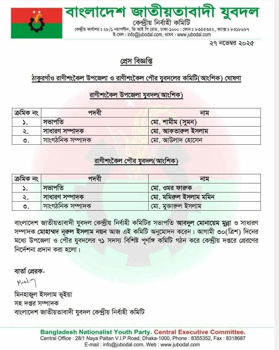 ঠাকুরগাঁওয়ের রানীশংকৈল উপজেলায় বাংলাদেশ জাতীয়তাবাদী উপজেলা যুবদলের ও পৌর যুবদলের আংশিক কমিটি গঠিত হয়েছে।