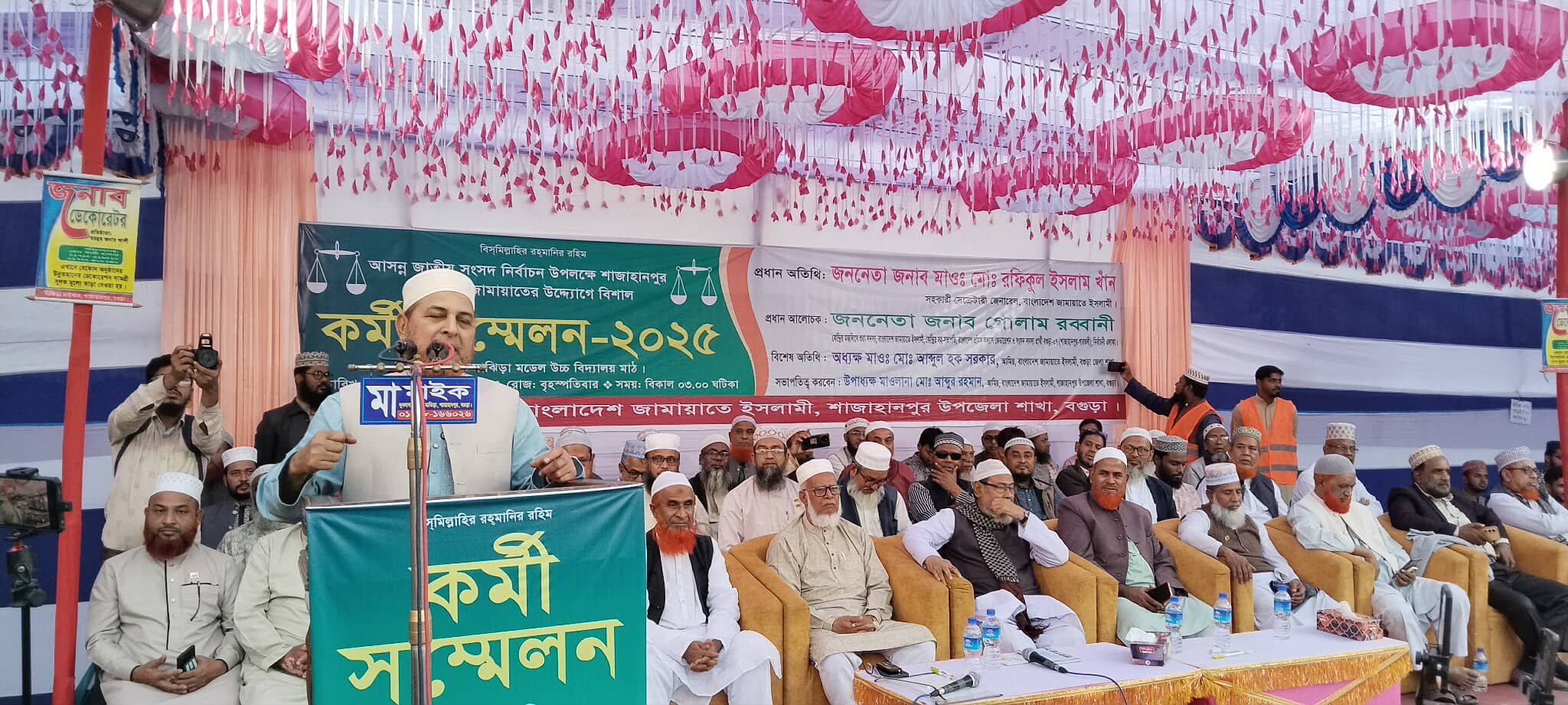 এসময় উপজেলা জামায়াতের আমীর উপাধ্যক্ষ মাওলানা আব্দুর রহমানের সভাপতিত্বে প্রধান অতিথি মাওলানা রফিকুল ইসলাম খাঁন আরও বলেন, বাংলাদেশ জামায়াতে ইসলামী প্রিয় বাংলাদেশে আল্লাহর আইন এবং সৎ লোকের শাসন কায়েম করতে চায়। আল্লাহর খলিফা করে মানুষকে এই পৃথিবীতে পাঠিয়েছেন। এই বাংলাদেশ স্বাধীন হওয়ার পর থেকে তিনটি দল দেশ শাসন করেছে এর মধ্যে একটি দল দেশ ছেড়ে পালিয়ে গেছে। এই উপমহাদেশে সৃষ্টি আলেম, বর্ষিয়ান নেতাদের প্রহসনের মিথ্যা মামলা দিয়ে ফাঁসি দেওয়া হয়েছে। এই শাজাহানপুরে আল্লামা দেলোয়ার হোসাইন সাঈদীর ফাঁসির রায় হওয়ার পর ৫ জন শহীদ হয়েছেন। এখানেই আল্লামা ফকির আব্দুর রহমান শায়িত আছেন। আরেকটি দল ভোট ছাড়া ৯ বছর শাসন করেছে। ভারতের দালালী করতে গিয়ে তৃতীয় দল ক্ষমতায় থেকে ৫ বার দূর্নীতিতে চ্যাম্পিয়ন হয়েছে। এজন্য সৎ লোকের শাসন দরকার। বাংলাদেশে চারটি বিশ্ববিদ্যালয়ে ছাত্রসংসদ নির্বাচনে বিপুল ভোটে ইসলামী ছাত্রশিবিরের প্যানেল বিজয়ী হয়েছে। দেশের মানুষ পরিবর্তন চায়। জুলাই বিপ্লব কোনো দলের নেতৃত্বে হয়নি। সাধারণ ছাত্রদের আন্দোলনের সর্বস্তরের মানুষ অংশ নেন। এই আন্দোলনে প্রায় দুই হাজার মানুষ শহীদ হয়েছে। এই বাংলাদেশ কারো বাপের, কোনো দলের নয়। বাংলাদেশ সবার। এই বাংলাদেশ কাদের এটা নির্ধারিন করে এদেশের জনগণ আগামী নির্বাচনে। বাংলাদেশে দূর্নীতি বন্ধ করতে পারলে এদেশ সোনার দেশে পরিণত হবে। মহিলারা মায়ের জাতী। বাংলাদেশ জামায়াতে ইসলামী ক্ষমতায় আসলে নারীরা সর্বোচ্চ মর্যাদা পাবে। একজন সুন্দরী রূপসী নারী চলাফেরা করবে কেউ ক্যু নজরে তাকানোর সাহস পাবেনা। একজন নারী যেখানে খুশি সেখানে চাকরি করতে পারবে। জামায়াতের কোনো নেতার হাতে কোনো হিন্দু, বৌদ্ধ, খ্রিষ্টানরা নির্যাতন হয়নি। অমুসলিমরা এখন জামায়াতে ইসলামীকে নিরাপদ মনে করতেছে।