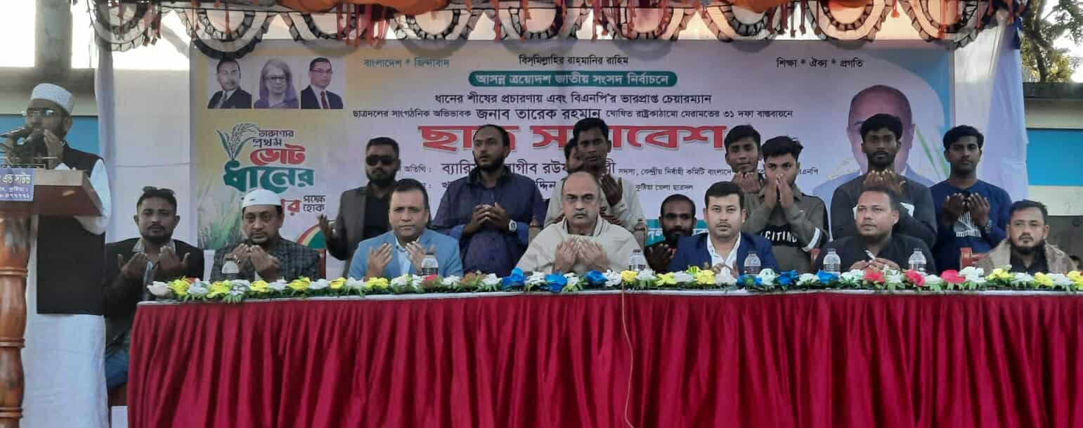 কুষ্টিয়ার মিরপুরে ত্রয়োদশ জাতীয় সংসদ নির্বাচন উপলক্ষে ধানের শীষের প্রচারণা এবং তারেক রহমান ঘোষিত রাষ্ট্র কাঠামো মেরামতের ৩১ তম বাস্তবায়নের ছাত্র সমাবেশ অনুষ্ঠিত হয়েছে। ছাত্র সমাবেশের শুরুতেই সাবেক প্রধানমন্ত্রী বিএনপির চেয়ারপার্সন বেগম খালেদা জিয়ার রোগ মুক্তি কামনায় বিশেষ দোয়া করা হয়। উপজেলা ও পৌর ছাত্রদলের যৌথ উদ্যোগে শনিবার বিকেলে মিরপুর পাইলট উচ্চ বিদ্যালয় মাঠে এ সমাবেশ অনুষ্ঠিত হয়। পৌর ছাত্রদলের আহ্বায়ক রোকনুজ্জামান রিন্টুর সভাপতিত্বে ছাত্র সমাবেশে প্রধান অতিথির বক্তব্যে বিএনপি'র জাতীয় নির্বাহী কমিটির সদস্য কুষ্টিয়া-২ (মিরপুর-ভেড়ামারা) আসনে বিএনপি মনোনীত সংসদ সদস্য পদপ্রার্থী ব্যারিস্টার রাগীব রউফ চৌধুরী বলেন, নিজের স্বার্থ জলাঞ্জলি দিয়ে দেশের মানুষের কল্যাণে কাজ করেছেন বেগম খালেদা জিয়া। তিনি ফ্যাসিস্ট সরকারের হয়রানি চূড়ান্ত শিখরে গিয়েও সেই সরকারের সঙ্গে আপোষ করেননি। দেশের গণতন্ত্র পুনরুদ্ধার করতে নির্বাচনের কোন বিকল্প নাই। তিনি বলেন এদেশের মানুষ নির্বাচনমুখী, গণতন্ত্রমুখী এবং তারা নির্বাচনে ভোটাধিকার প্রয়োগে জন্য উদগীব হয়ে আছে। দেশের স্বাধীনতাসহ সকল গণতান্ত্রিক অধিকার আদায়ের আন্দোলনে ছাত্র সমাজের অগ্রণী ভূমিকার ছিল। অনুষ্ঠানের প্রধান বক্তা ছিলেন জেলা ছাত্রদলের সদস্য সচিব খন্দকার তসলিম উদ্দিন নিশাত। এতে বিশেষ অতিথি ছিলেন ভেড়ামারা উপজেলা বিএনপির সদস্য সচিব শাজাহান আলী। উপজেলা ছাত্রদলের সদস্য সচিব ছাব্বির আহম্মেদের পরিচালনায় এ সময়ে উপজেলা যুবদলের যুগ্ম আহবায়ক কামরুজ্জামান কাকন, শরিফুল ইসলাম, উপজেলা কৃষকদলের আহবায়ক অ্যাডভোকেট খন্দকার খায়রুজ্জামান খাইরুল, যুগ্ম আহ্বায়ক ইঞ্জিনিয়ার জাকিরুল ইসলাম লিটন, মৎস্যজীবী দলের আহ্বায়ক মনিরুজ্জামান মনির, জেলা ছাত্রদলের যুগ্ম আহ্বায়ক সাবিত আহমেদ, মিরপুর উপজেলা ছাত্রদলের আহ্বায়ক খন্দকার আতিকুর রহমান তুষার, ভেড়ামারা উপজেলা ছাত্রদলের সদস্য সচিব ওয়াসিম আহমেদ, পৌর ছাত্রদলের সদস্য সচিব অমিত রায়, মিরপুর পৌর ছাত্রদলের সদস্য সচিব মনিরুজ্জামান মনির, জেলা ছাত্রদলের সদস্য নিলয় গাজী, আবু বাশার সৈকত, শামীম হোসেন, আমলা সরকারি কলেজ ছাত্রদলের সদস্য সচিব সাজ্জিদ আহমেদ শান্ত প্রমুখ উপস্থিত ছিলেন।
