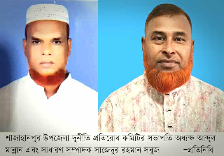দুর্নীতি দমন কমিশন (দুদক) রাজশাহী বিভাগীয় কার্যালয় কর্তৃক বগুড়ার শাজাহানপুর উপজেলা দুর্নীতি প্রতিরোধ কমিটি (দুপ্রক) পুন:র্গঠন করা হয়েছে। সাজাপুর ফুলতলা আহম্মদিয়া কামিল মাদ্রাসার অধ্যক্ষ আব্দুল মান্নান কে সভাপতি এবং দৈনিক করতোয়া'র উপজেলা প্রতিনিধি সাজেদুর রহমান সবুজ কে সাধারণ সম্পাদক করে ৯ সদস্য বিশিষ্ট পুন:র্গঠিত কমিটি ঘোষণা করা হয়েছে। শাজাহানপুর উপজেলা নির্বাহী অফিসার মো. তাইফুর রহমানের সভাপতিত্বে আজ মঙ্গলবার (০২ ডিসেম্বর) বিকালে উপজেলা পরিষদ সভাকক্ষে পুন:র্গঠিত কমিটির পরিচিতি, বিদায়ী কমিটির দায়িত্ব হস্তান্তর ও নতুন কমিটির গ্রহণসহ আগামী ৯ ডিসেম্বর আন্তর্জাতিক দুর্নীতি বিরোধী দিবস উদ্যাপনের প্রস্তুতি বিষয়ক এক সভা অনুষ্ঠিত হয়। বিদায়ী কমিটির সভাপতি বীরমুক্তিযোদ্ধা নীরেন্দ্র মোহন সাহা, সাধারণ সম্পাদক সাজেদুর রহমান সবুজ, সহ-সভাপতি মেছবাউল আলম, সদস্য আফজাল হোসেন আনুষ্ঠানিক ভাবে নতুন কমিটির নিকট দায়িত্ব হস্তান্তর করেন।