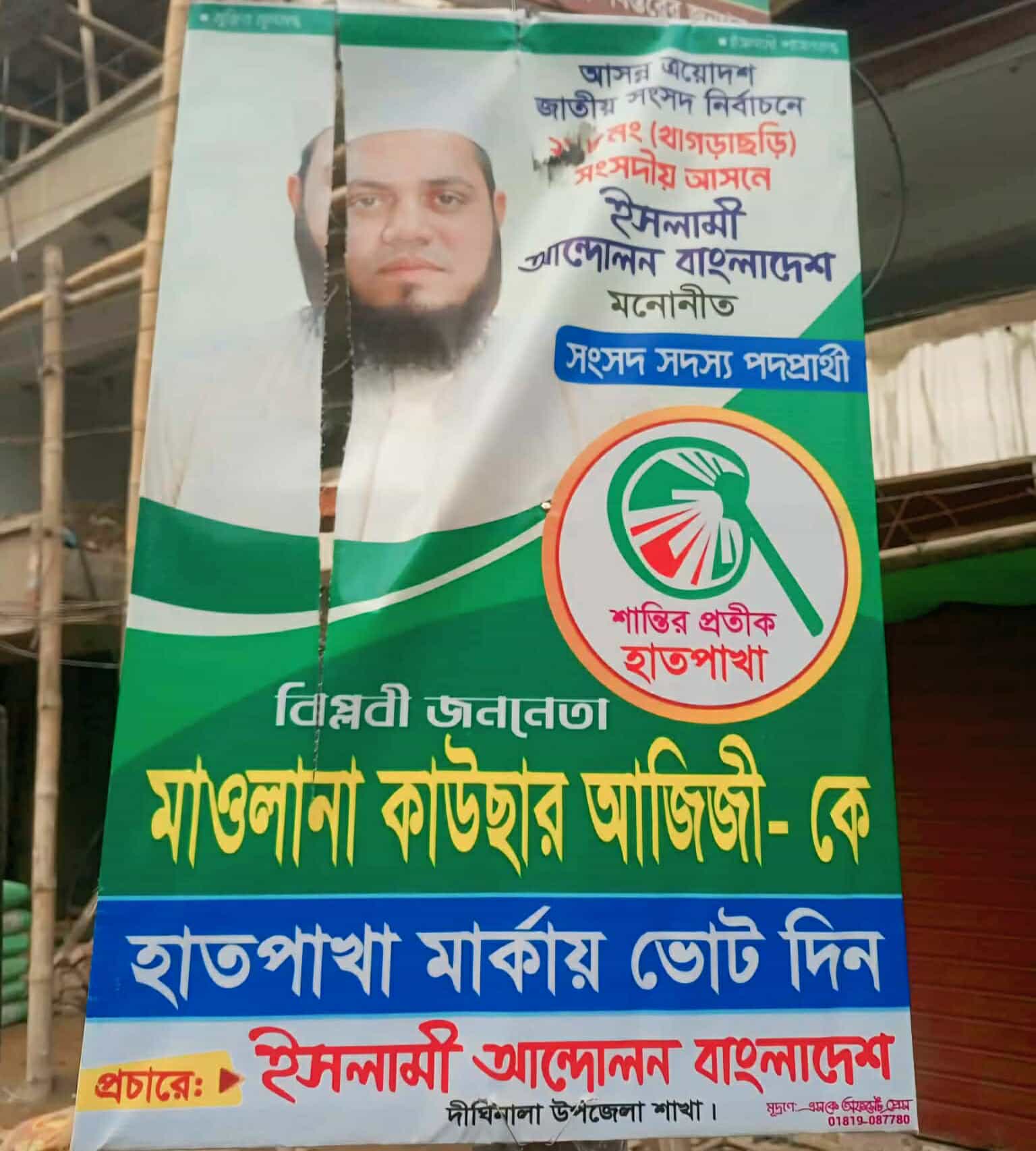 খাগড়াছড়ি জেলার দীঘিনালা উপজেলায় ইসলামী আন্দোলন বাংলাদেশ–এর নির্বাচনী প্রচারণার পোস্টার ও ব্যানার ছেঁড়ে ফেলেছে দুর্বৃত্তরা। দলটির কেন্দ্রীয় মনোনয়নপ্রাপ্ত খাগড়াছড়ি-২৯৮ আসনের এমপি প্রার্থী মাওলানা কাউসার আজিজের হাত পাখা প্রতীকের এসব প্রচারণাসামগ্রী বিভিন্ন স্থানে লাগানো ছিল।