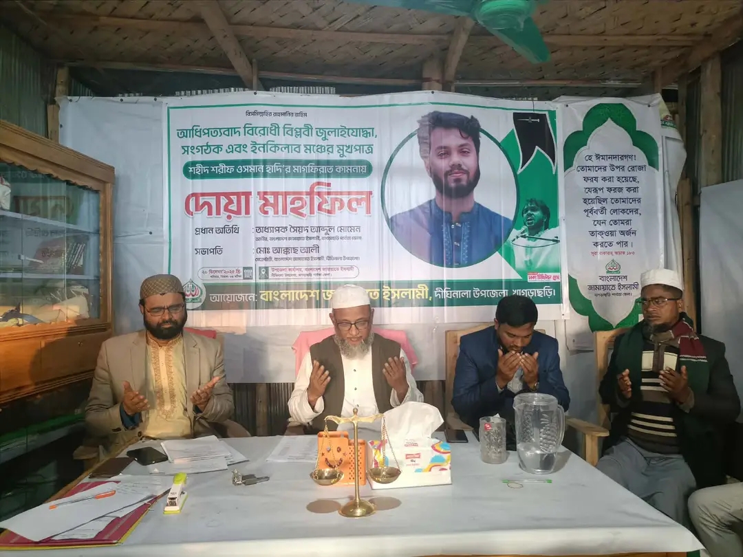 খাগড়াছড়ির দীঘিনালা উপজেলায় শহীদ শরীফ ওসমান হাদির রূহের মাগফিরাত কামনায় এক দোয়া মাহফিল অনুষ্ঠিত হয়েছে।শনিবার (২০ ডিসেম্বর) বিকাল ৪টায় দীঘিনালা উপজেলা জামায়াতে ইসলামী’র নিজস্ব কার্যালয়ে এ দোয়া মাহফিলের আয়োজন করা হয়। আধিপত্যবাদবিরোধী বিপ্লবী জুলাইযোদ্ধা, সংগ্রামী ও ইনকিলাবী যুবনেতা শহীদ শরীফ ওসমান হাদির শাহাদাত স্মরণেই এই কর্মসূচি পালিত হয়।