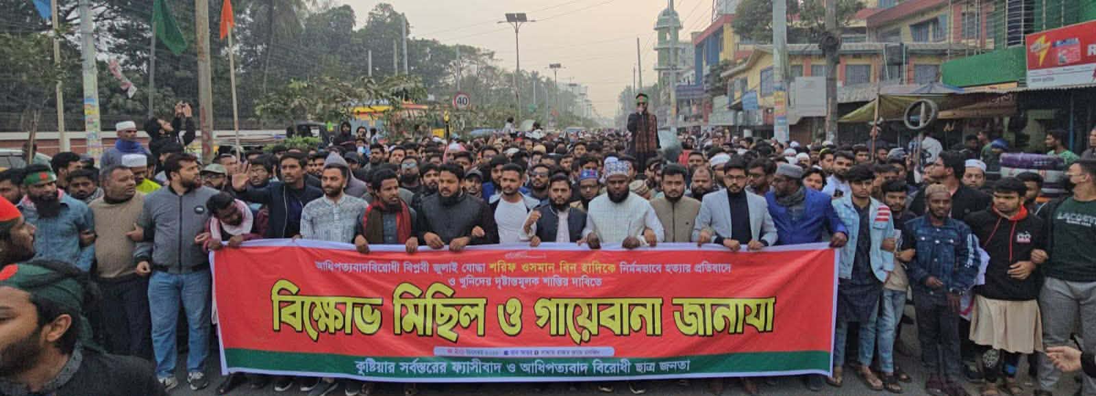 জুলাই গণঅভ্যুত্থানের অকুতোভয় যোদ্ধা শরীফ ওসমান হাদিকে নির্মমভাবে হত্যার প্রতিবাদে ও হত্যাকাণ্ডের সঙ্গে জড়িত খুনিদের দ্রুত গ্রেপ্তার ও দৃষ্টান্তমূলক শাস্তির দাবিতে কুষ্টিয়ায় বিক্ষোভ মিছিল অনুষ্ঠিত হয়েছে। শনিবার বিকেলে কুষ্টিয়া শহরে এ বিক্ষোভ মিছিল অনুষ্ঠিত হয়। কুষ্টিয়া শহরের সাদ্দাম বাজার মোড় থেকে ‘কুষ্টিয়ার সর্বস্তরের ফ্যাসিবাদ ও আধিপত্যবাদ বিরোধী ছাত্র-জনতা’র ব্যানারে একটি বিক্ষোভ মিছিল বের হয়। মিছিলটি শহরের প্রধান প্রধান সড়ক প্রদক্ষিণ করে। এসময় অংশগ্রহণকারীরা শরিফ ওসমান বিন হাদির হত্যাকারীদের ফাঁসি এবং আধিপত্যবাদের বিরুদ্ধে বিভিন্ন স্লোগান দেন। মিছিলটি মজমপুর গেট অতিক্রম করে শহরের পাঁচ রাস্তার মোড়ে গিয়ে সংক্ষিপ্ত সমাবেশে মিলিত হয়। সংক্ষিপ্ত সমাবেশে বক্তব্য রাখেন, কুষ্টিয়া জেলা জামায়াতের আমীর মাওলানা আবুল হাসেম, কুষ্টিয়া-৩ আসনে জামায়াতে ইসলাম মনোনীত সংসদ সদস্য পদপ্রার্থী হাফেজ মুফতি মাওলানা আমির হামজা,কুষ্টিয়া শহর শিবিরের সভাপতি হাফেজ মাঃ আবু ইউসুফ, গণধিকার পরিষদ কুষ্টিয়া জেলা শাখার সাংগঠনিক সম্পাদক তৌকিক আহমেদ, বৈষম্য বিরোধী ছাত্র আন্দোলন কুষ্টিয়া জেলা শাখার সদস্য সচিব মুস্তাফিজুর রহমান প্রমুখ।