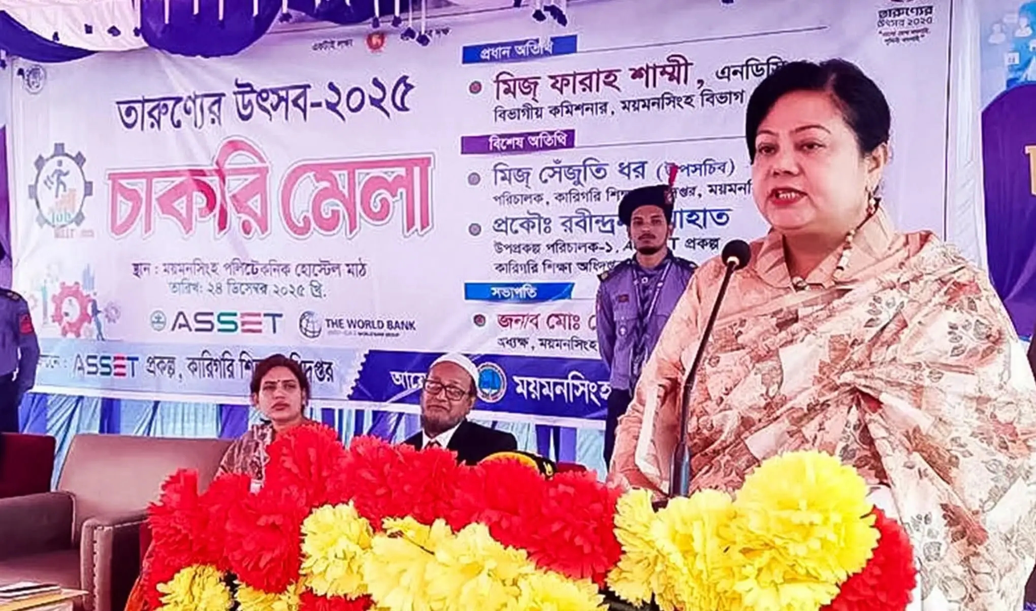 এতে প্রধান অতিথি হিসেবে উপস্থিত ছিলেন ময়মনসিংহ বিভাগীয় কমিশনার ফারাহ শাম্মী (এনডিসি)। তিনি চাকরি মেলার আনুষ্ঠানিক উদ্বোধন ঘোষণা করেন। বিশেষ অতিথি হিসেবে উপস্থিত ছিলেন কারিগরী শিক্ষা অধিদপ্তরের পরিচালক (উপসচিব) সেঁজুতি ধর এবং এসেট প্রকল্পের উপপ্রকল্প পরিচালক প্রকৌশলী রবীন্দ্রনাথ মাহাত।