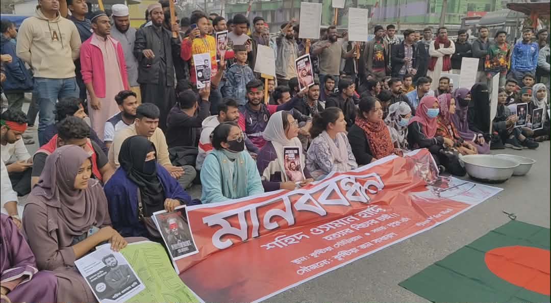 কুষ্টিয়ায় ইনকিলাব মঞ্চের মুখপাত্র শরিফ ওসমান হাদি হত্যার বিচারের দাবিতে মহাসড়ক অবরোধ করে বিক্ষোভ করছেন জনসাধারণ। শনিবার (২৭ ডিসেম্বর) দুপুর আড়াইটায় কুষ্টিয়ার জনসাধারণের ব্যানারে শহীদ আবরার ফাহাদ স্টেডিয়াম এলাকা থেকে বিক্ষোভ মিছিল বের হয়। এরপর সেটি শহরের বিভিন্ন সড়ক প্রদক্ষিণ করে মজমপুর গেটে জড়ো হন। সেখানে বসে অবস্থান নেন তারা। এতে কুষ্টিয়া-ঝিনাইদহ ও ঈশ্বরদী মহাসড়কে যানবাহন চলাচল বন্ধ হয়ে যায়। এসময় বিক্ষোভকারীরা ভারত ও আওয়ামী লীগবিরোধী বিভিন্ন স্লোগান দেন এবং হাদি হত্যার সঙ্গে জড়িতদের কঠোর বিচার দাবি করেন। পাশাপাশি হাদি হত্যার বিচারের বিষয়ে স্বরাষ্ট্র ও আইন উপদেষ্টা যতক্ষণ না পর্যন্ত প্রশাসনের মাধ্যমে তাদের আশ্বস্ত করবেন, ততক্ষণ পর্যন্ত এ কর্মসূচি চলবে বলে জানিয়েছেন তারা।