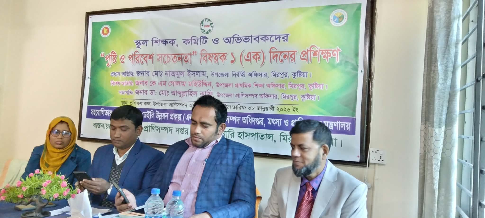 কুষ্টিয়ার মিরপুরে স্কুল শিক্ষক, কমিটি ও অভিভাবকদের পুষ্টি ও পরিবেশ সচেতনতা বিষয়ক এক দিনের প্রশিক্ষণ অনুষ্ঠিত হয়েছে। উপজেলা প্রাণিসম্পদ ও ভেটেরিনারি হাসপাতালে উদ্যোগে এবং প্রাণিসম্পদ ও ডেইরী উন্নয়ন প্রকল্প (এলডিডিপি)'র সহযোগিতায় বৃহস্পতিবার দুপুরে প্রাণিসম্পদের প্রশিক্ষণ রুমে এ প্রশিক্ষণ অনুষ্ঠিত হয়। উপজেলা প্রাণিসম্পদ কর্মকর্তা ডাঃ আব্দুল্লাহিল কাফির সভাপতিত্বে অনুষ্ঠানে প্রধান অতিথি ছিলেন উপজেলা নির্বাহী কর্মকর্তা নাজমুল ইসলাম। এতে বিশেষ অতিথি ছিলেন উপজেলা সহকারী কমিশনার (ভূমি) ঈষিতা আক্তার, মিরপুর থানার ওসি শহিদুল ইসলাম, উপজেলা শিক্ষা কর্মকর্তা কে এম গোলাম মহিউদ্দিন, উপজেলা প্রকল্প বাস্তবায়ন মাহফুজুর রহমান, সোনালী ব্যাকের এজিএম শামসুল ইসলাম, পৌরসভার সচিব আব্দুল হান্নান, প্রেসক্লাবের সভাপতি মারফত আফ্রিদী, সাধারণ সম্পাদক রাশেদুজ্জামান রিমন প্রমুখ।