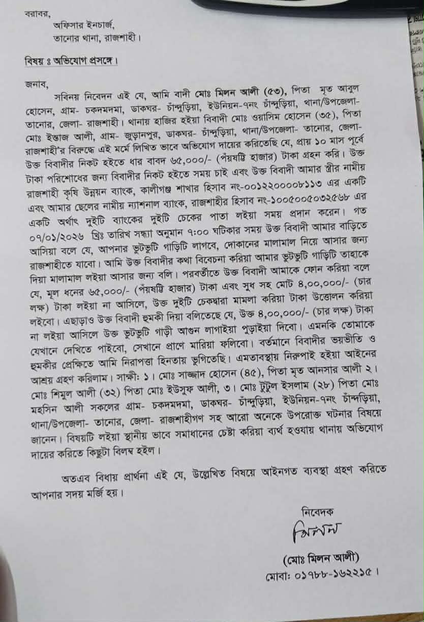 রাজশাহীর তানোর উপজেলায় সুদের টাকা আদায়ের নামে ভয়ভীতি ও প্রাণনাশের হুমকির অভিযোগে থানায় লিখিত অভিযোগ দায়ের করা হয়েছে। অভিযোগকারী মোঃ মিলন আলী (৫৩) পিতা মৃত আবুল হোসেন। তিনি উপজেলার ৭নং চাঁন্দুড়িয়া ইউনিয়নের চকদমদমা গ্রামের বাসিন্দা।