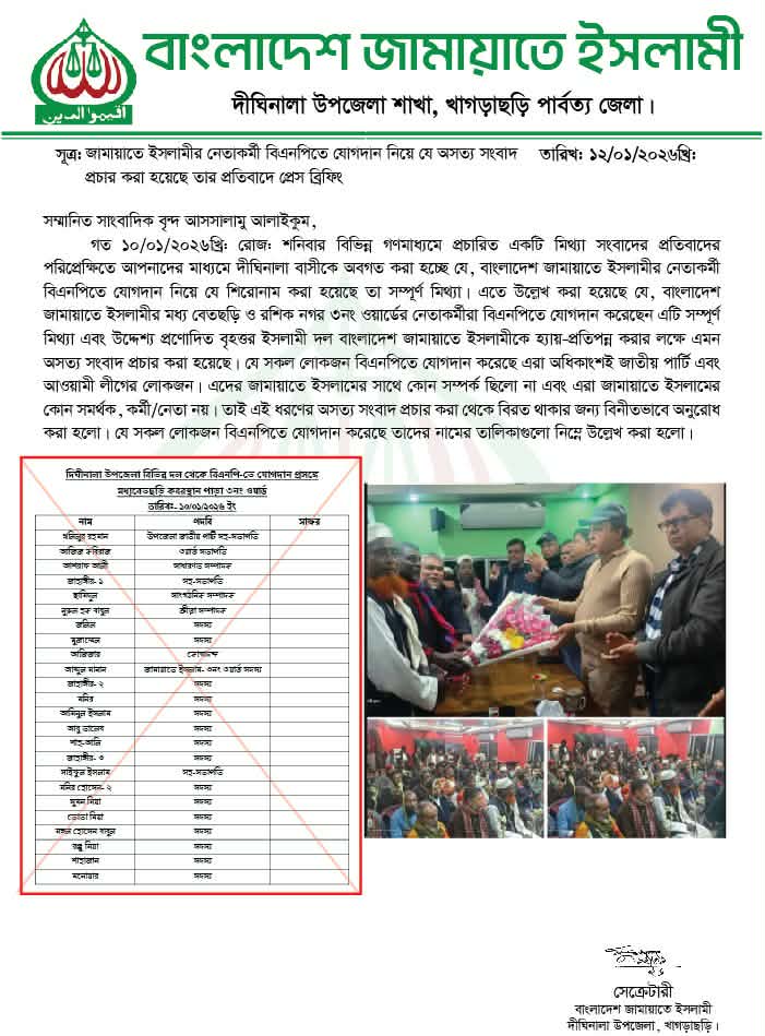 বাংলাদেশ জামায়াতে ইসলামীর দীঘিনালা উপজেলা শাখার নেতাকর্মীরা বিএনপিতে যোগ দিয়েছেন—এমন খবর সম্পূর্ণ মিথ্যা ও বানোয়াট বলে দাবি করেছে জামায়াতে ইসলামী।