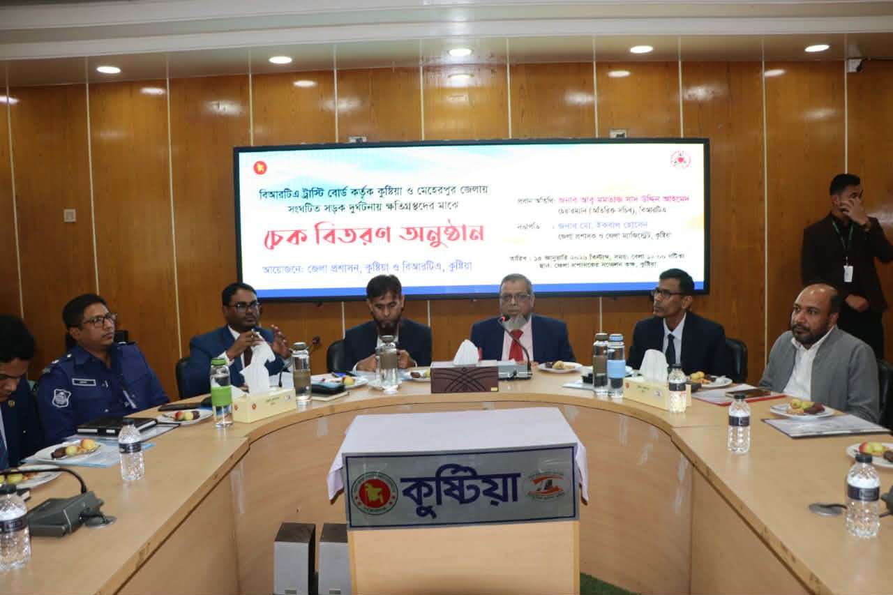 সড়ক দুর্ঘটনায় ক্ষতিগ্রস্ত পরিবারসমূহকে আর্থিক সহায়তা প্রদানের লক্ষ্যে বাংলাদেশ রোড ট্রান্সপোর্ট অথরিটি (বিআরটিএ) ট্রাস্টি বোর্ডের উদ্যোগে বৃহস্পতিবার বেলা ১২টায় কুষ্টিয়া জেলা প্রশাসক সম্মেলন কক্ষে এ চেক হস্তান্তর করেন বিআরটিএ'র চেয়ারম্যান আবু মমতাজ সাদ উদ্দিন আহমেদ। অনুষ্ঠানে কুষ্টিয়া জেলায় সংঘটিত সড়ক দুর্ঘটনায় ক্ষতিগ্রস্ত মোট ৪৮টি পরিবারের মাঝে আর্থিক সহায়তার চেক প্রদান করা হয়। এর মধ্যে আহত ১৩টি পরিবারের মধ্যে ৫টি পরিবারকে ৩ লাখ টাকা করে এবং ৮টি পরিবারকে ১ লাখ টাকা করে মোট ২৩ লাখ টাকা এবং নিহত ৩৫টি পরিবারকে ৫ লাখ টাকা করে মোট ১ কোটি ৭৫ লক্ষ টাকা প্রদান করা হয়। কুষ্টিয়া জেলার জন্য সর্বমোট ১ কোটি ৯৮ লক্ষ টাকার চেক বিতরণ করা হয়। এছাড়াও মেহেরপুর জেলায় সংঘটিত সড়ক দুর্ঘটনায় ক্ষতিগ্রস্ত মোট ২২টি পরিবারের মাঝে আর্থিক সহায়তার চেক প্রদান করা হয়। এর মধ্যে আহত ৮টি পরিবারের মধ্যে ২টি পরিবারকে ৩ লাখ টাকা করে এবং ৬টি পরিবারকে ১ লাখ টাকা করে মোট ১২ লক্ষ টাকা এবং নিহত ১৪টি পরিবারকে ৫ লাখ টাকা করে মোট ৭০ লক্ষ টাকা প্রদান করা হয়। মেহেপুর জেলার জন্য সর্বমোট ৮০, লক্ষ টাকার চেক বিতরণ করা হয়। জেলা প্রশাসক ইকবাল হোসেনের সভাপতিত্বে এ সময়ে কুষ্টিয়া বিআরটিএর সহকারি পরিচালক মাহাবুবি রব্বানি প্রমুখ উপস্থিত ছিলেন।