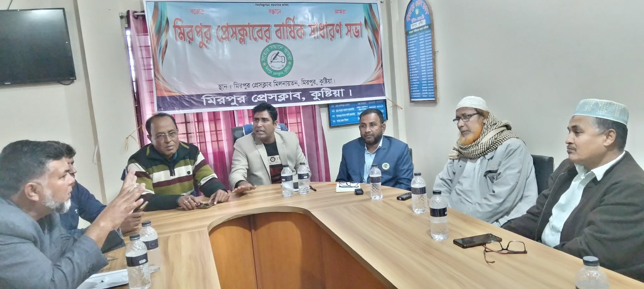 কুষ্টিয়ার মিরপুর প্রেসক্লাবের বার্ষিক সাধারণ সভা অনুষ্ঠিত হয়েছে। শনিবার সকালে ক্লাব মিলনায়তনে এ সভা অনুষ্ঠিত হয়। ক্লাবের সভাপতি মারফত আফ্রিদীর সভাপতিত্বে ও সাধারণ সম্পাদক রাশেদুজ্জামান রিমনের পরিচালনায় এ সময়ে ক্লাবের সাবেক সভাপতি আছাদুর রহমান বাবু, বাবলু রঞ্জন বিশ্বাস, কাঞ্চন কুমার হালদার, সাবেক আহ্বায়ক হুমায়ুন কবির হিমু, সহ-সভাপতি অধ্যাপক আব্দুস সালাম, সাবেক সাধারণ সম্পাদক আব্দুল মজিদ জোয়ার্দ্দার, সাংগঠনিক সম্পাদক কুদরতে খোদা সবুজ, অর্থ সম্পাদক হাফিজুর রহমান, সদস্য আলমগীর মন্ডল, শেফাদুল ইসলাম চান্নু, মিলন আলী, আবু হেনা মস্তফা কামাল, জাহিদ হাসান জিহাদ, আশরাফুল আলম হীরা, আলমগীর কবির প্রমুখ উপস্থিত ছিলেন। সভায় ক্লাবের সাহিত্য সংস্কৃতিক ও ক্রীড়া সম্পাদক আব্দুল মালেক জোয়ার্দ্দারে মৃত্যুতে শোক প্রস্তাব গৃহিত হয়। এ ছাড়াও অর্থ সম্পাদক হাফিজুর রহমান ক্লাবের বাৎসরিক আয় ব্যয় বিবরণী পেশ করেন। ক্লাবের বার্ষিক আনন্দ ভ্রমণ, কর্মকাণ্ডে গতিশীল ও ঐক্যবৃদ্ধির বিষয়ে বিস্তারিত আলোচনা করা হয়। সভার পূর্বে ক্লাবের সাহিত্য সংস্কৃতিক ও ক্রীড়া সম্পাদক আব্দুল মালেক জোয়ার্দ্দার ও সাংগঠনিক সম্পাদক কুদরতে খোদা সবুজের পিতা শফিউল্লাহ শেখের রুহের মাগফেরাত কামনা করে দোয়া মোনাজাত করা হয়।