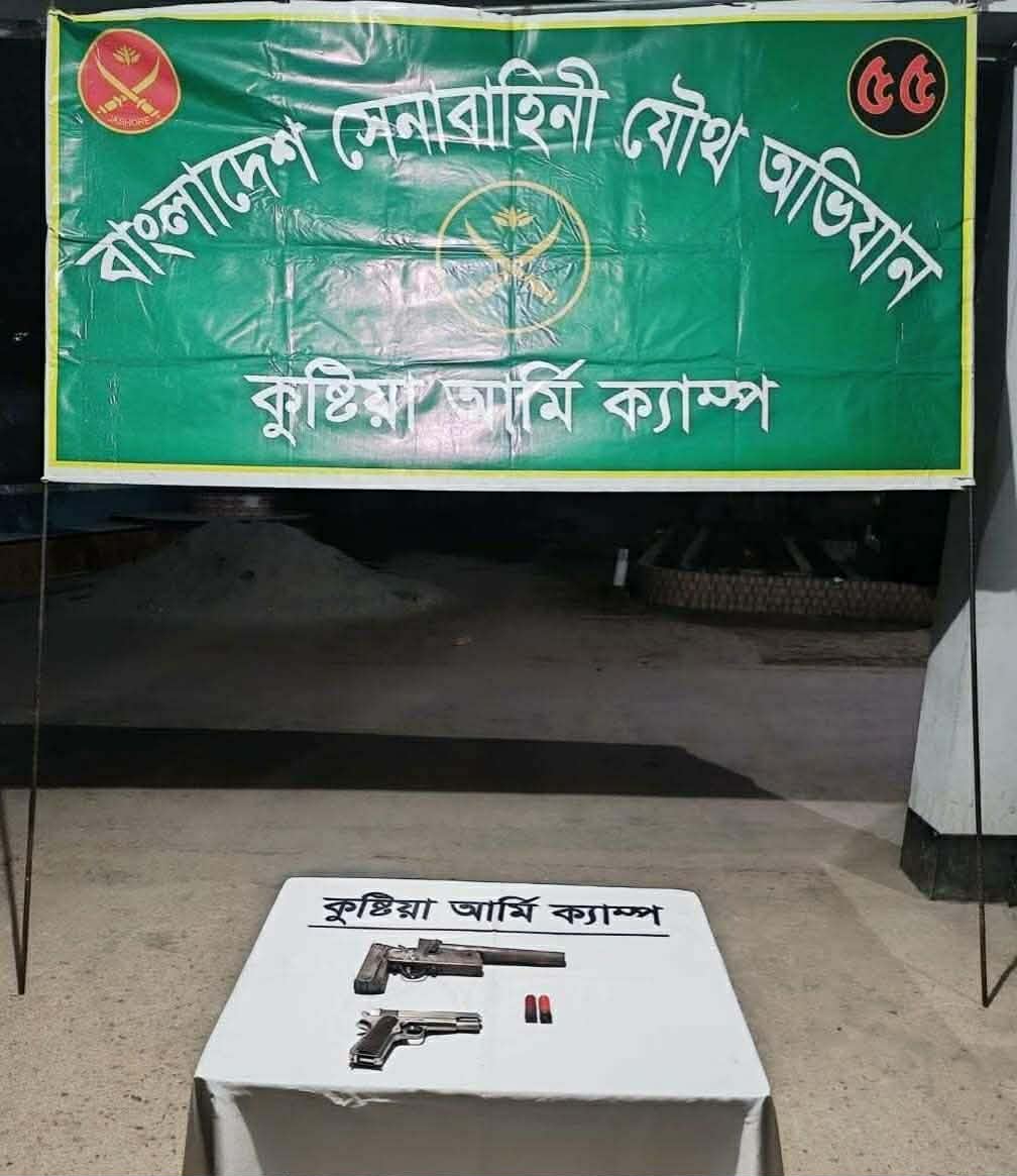 কুষ্টিয়ায় যৌথ বাহিনী অভিযান চালিয়ে পরিত্যাক্ত অবস্থায় অস্ত্র ও গুলি উদ্ধার করেছে। সেনাবাহিনী ও পুলিশের যৌথ অভিযানে শুক্রবার রাতে জেলার ভেড়ামারা উপজেলার রামকৃষ্ণপুর গ্রামে মৃত সফর উদ্দিনের ছেলে মাহমুদ আল ইমরানের (৪৫) বসতবাড়ীর পশ্চিমপাশের টয়লেটের ছাদ থেকে পরিত্যক্ত অবস্থায় ১টি বিদেশী পিস্তল, ১টি দেশীয় ওয়ান শুটার গান ও ২ রাউন্ড গুলি উদ্ধার করে। ভেড়ামারা থানার ওসি জায়েদুর রহমান ঘটনার সত্যতা নিশ্চিত করে বলেন অস্ত্র ও গুলি পরিত্যক্ত অবস্থায় পাওয়ার যাওয়ায় জিডি মূলে বিজ্ঞ আদালতে আলামত প্রেরণ করা হয়েছে।