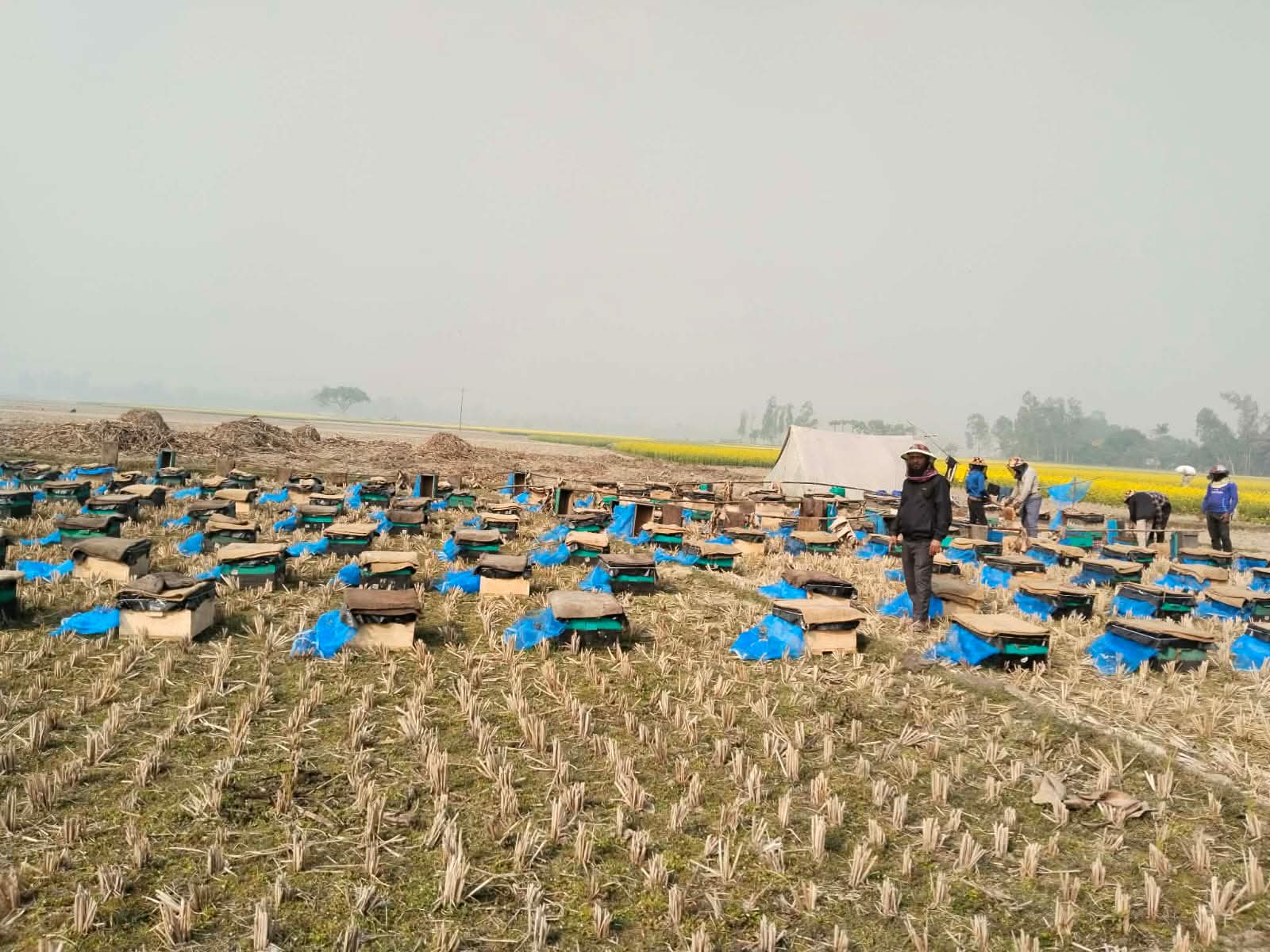 সরিষা মাঠের পাশে সারি সারি কাঠের বাক্সে রাখা হয়েছে মৌচাক। সেই বাক্স থেকে সকাল-বিকাল খামারিরা মধু সংগ্রহ করছেন। তাদের ভাষায়, সরিষা ফুলের মধু স্বাদে ও মানে ভালো হওয়ায় বাজারে এর চাহিদাও বেশি থাকে।