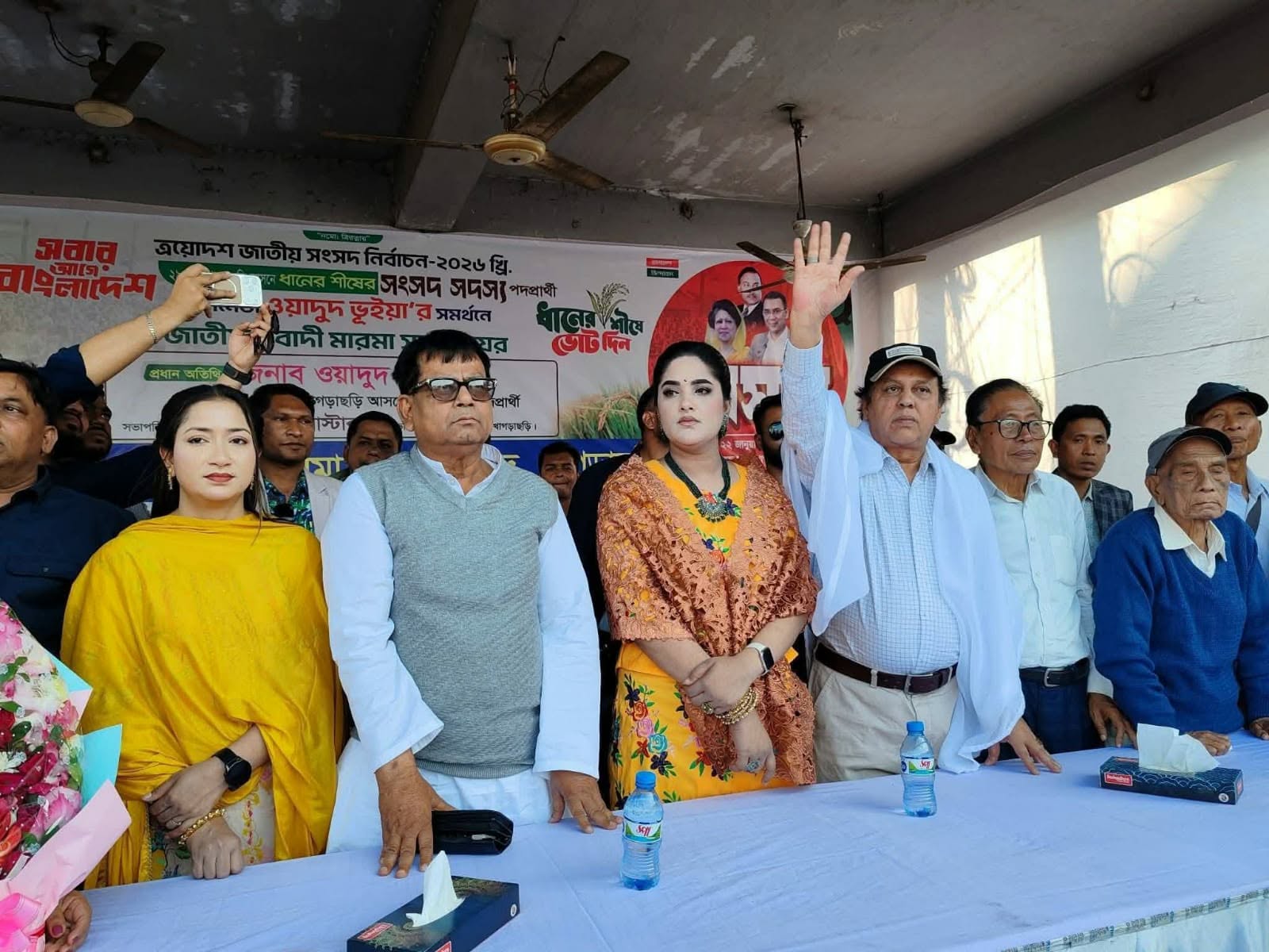 এর আগে পথসভাস্থলে মারমা সম্প্রদায়ের নারী-পুরুষেরা হাতে ধানের ছড়া নিয়ে নির্বাচনী থিম সংয়ের তালে তালে নাচেন।