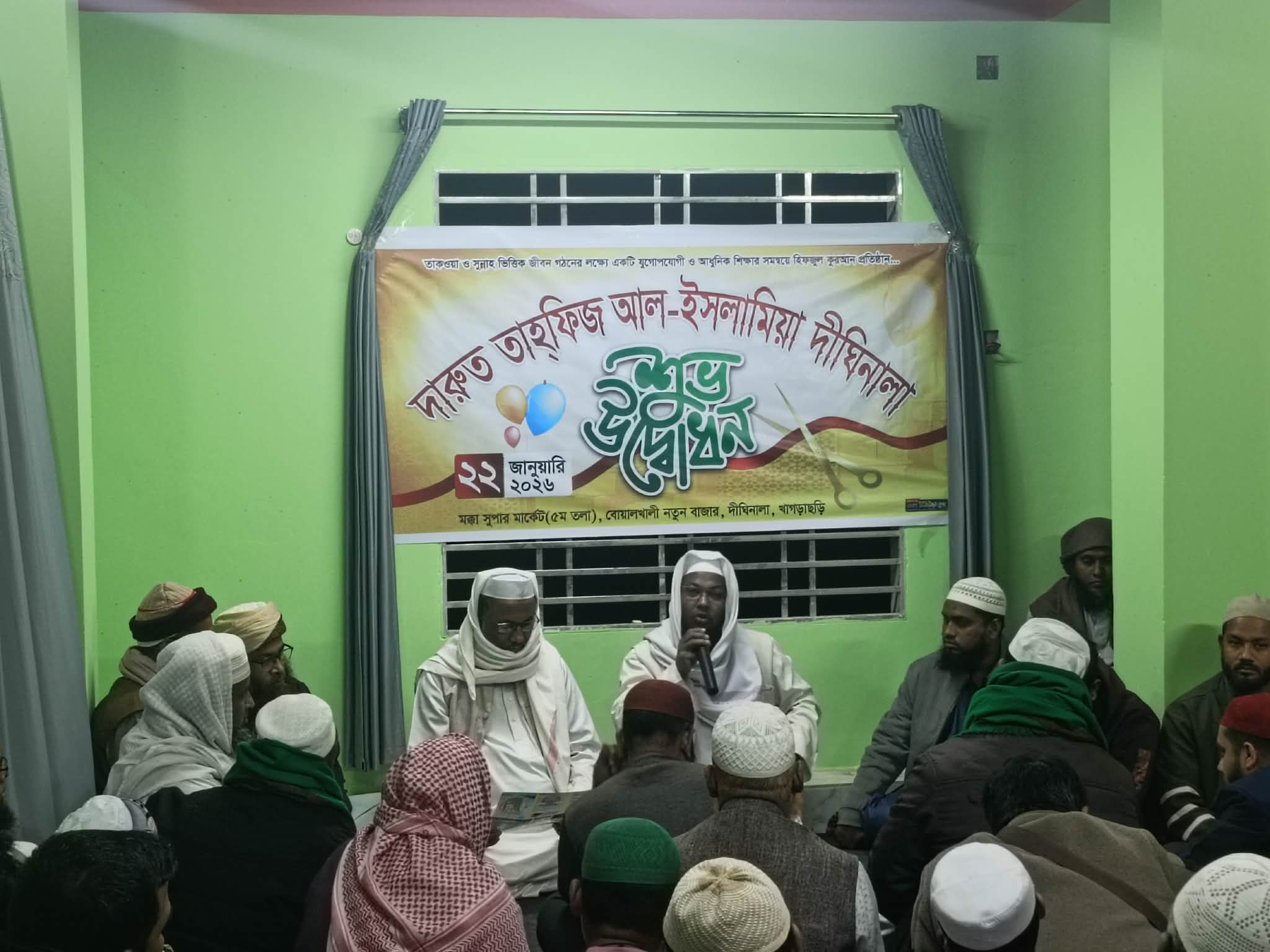 খাগড়াছড়ির দীঘিনালায় কুরআন ও আদর্শ ইসলামী শিক্ষার প্রসারে নতুন একটি প্রতিষ্ঠান হিসেবে যাত্রা শুরু করেছে দারুত তাহফিজ আল-ইসলামিয়া দীঘিনালা। বৃহস্পতিবার (২২ জানুয়ারি) এশার নামাজ শেষে আনুষ্ঠানিকভাবে মাদ্রাসাটির উদ্বোধন করা হয়।