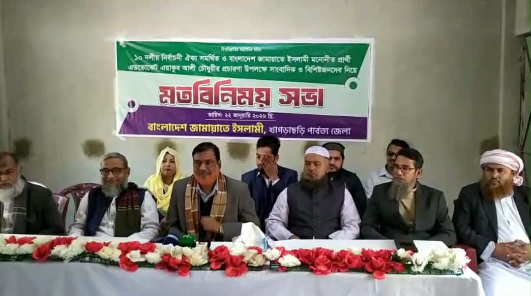 মতবিনিময় সভায় জামায়াত প্রার্থী এডভোকেট এয়াকুব আলী চৌধুরী আরো বলেন, মেধার মূল্যায়নসহ পার্বত্যাবাসীর ভাগ্যের পরিবর্তন চায় জামায়াত। স্বাস্থ্য খাতে পিঁছিয়ে থাকা পার্বত্য জেলা খাগড়াছড়ির জন্য মেডিকেল কলেজসহ শিক্ষা,শিল্প কারখানাসহ কৃষিখাতে আরো অগ্রগতি জরুরী। সে বিষয়ে নির্বাচিত হলে পরিকল্পনার কথা জানান তিনি।