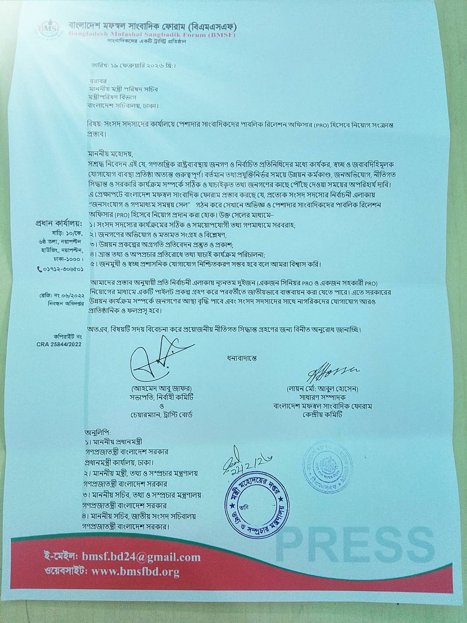 সংসদ সদস্যদের কার্যালয়ে পেশাদার সাংবাদিকদের পাবলিক রিলেশন অফিসার (PRO) হিসেবে নিয়োগের প্রস্তাবনা মন্ত্রিপরিষদ সচিবের নিকট আনুষ্ঠানিকভাবে জমা দিয়েছে বাংলাদেশ মফস্বল সাংবাদিক ফোরাম।