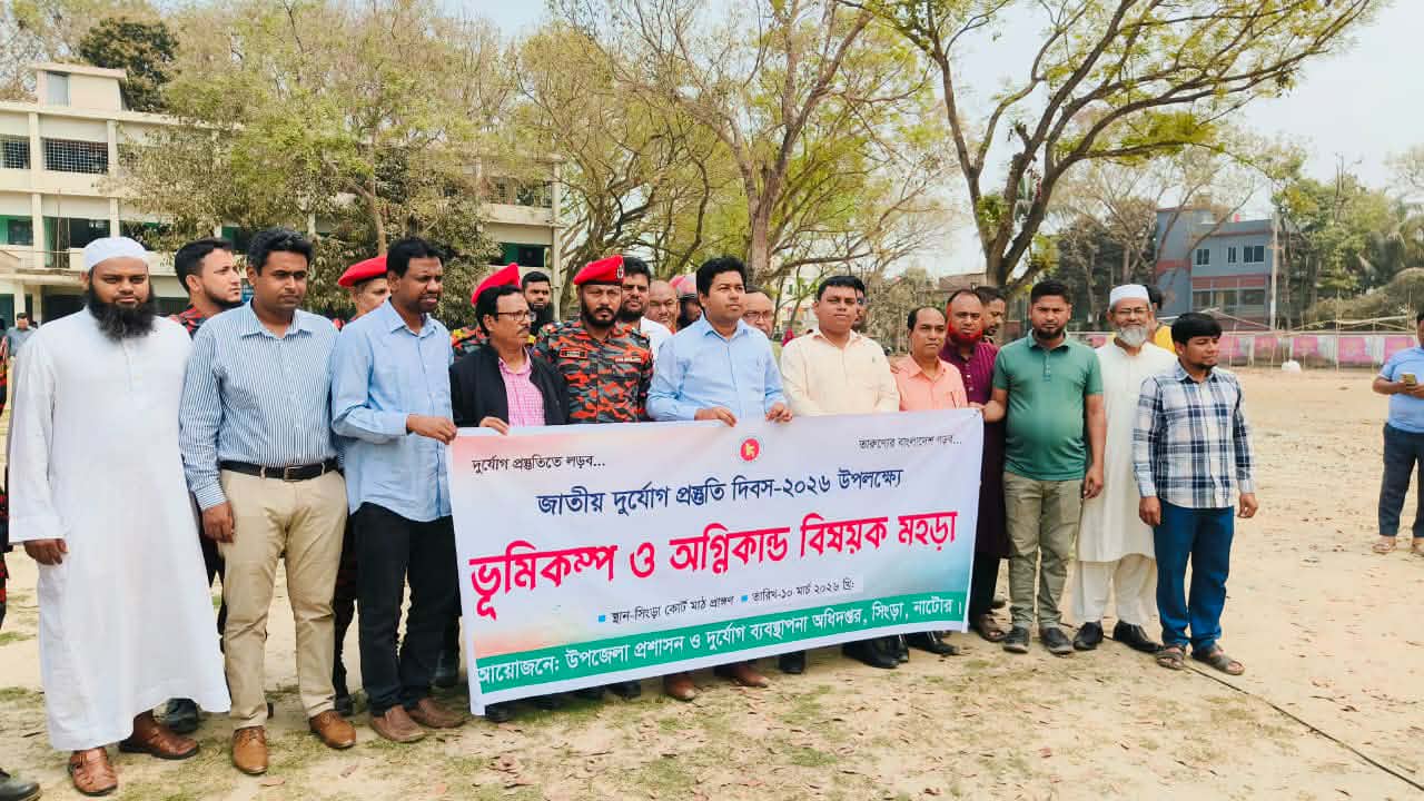 "দুর্যোগ প্রস্তুতিতে লড়ব, তারুণ্যের বাংলাদেশ গড়ব" এই প্রতিপাদ্য নিয়ে নাটোরের সিংড়ায় জাতীয় দুর্যোগ প্রস্তুতি দিবস-২০২৬ উদযাপন উপলক্ষে ভূমিকম্প ও অগ্নিকান্ড বিষয়ক মহড়া অনুষ্ঠিত হয়েছে।