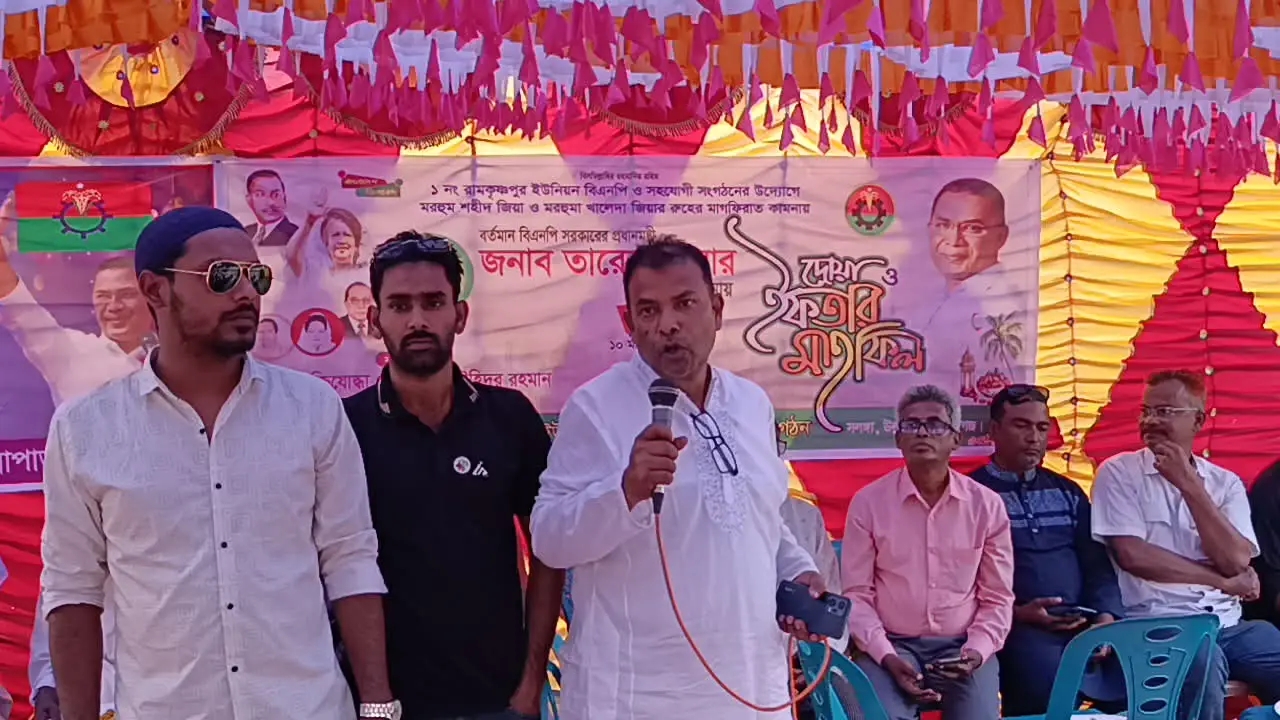 অনুষ্ঠানে অন্যান্যের মধ্যে উপস্থিত ছিলেন উপজেলা বিএনপির সাবেক যুগ্ম আহবায়ক জাহিদুল ইসলাম মিস্টার চেয়ারম্যান,সাবেক সদস্য তৌহিদুল ইসলাম জুয়েল,যুবদলের যুগ্ম আহবায়ক আজমল তালুকদার,রামকৃষ্ণপুর ইউনিয়ন বিএনপির সাবেক সভাপতি আফছার উদ্দিন,বাঙ্গালা ইউনিয়ন বিএনপির সাবেক সভাপতি আব্দুল জলিল সরকার,সলঙ্গা থানা স্বেচ্ছাসেবক দলের সদস্য সচিব রন্জু আহমেদ মুন্সিসহ রামকৃষ্ণপুর ইউনিয়ন বিএনপি অঙ্গ ও সহযোগী সংগঠনের হাজারো নেতাকর্মী। পরিশেষে ইফতার ও দোয়া মাহফিলে মরহুম শহীদ জিয়াউর রহমান,মরহুমা বেগম খালেদা জিয়ার রুহের মাগফেরাত কামনা করে এবং গণপ্রজাতন্ত্রী বাংলাদেশের প্রধানমন্ত্রী তারেক রহমানের সুস্বাস্থ্য,দীর্ঘায়ু ও কল্যাণ কামনাসহ দেশ জাতির সমৃদ্ধি কামনা করে বিশেষ মোনাজাত করা হয়।