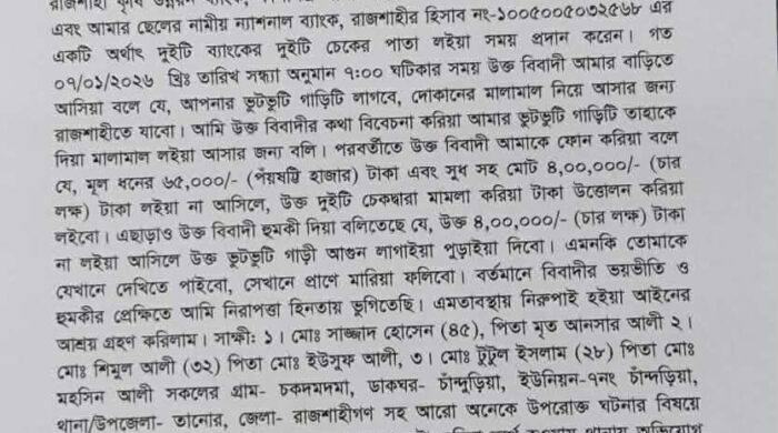 আশরাফুল ইসলাম রনজু তানোর (রাজশাহী) প্রতিনিধি রাজশাহীর তানোর উপজেলায় সুদের টাকা আদায়ের নামে ভয়ভীতি ও প্রাণনাশের হুমকির অভিযোগে থানায় লিখিত অভিযোগ দায়ের করা হয়েছে। অভিযোগকারী মোঃ মিলন আলী (৫৩)