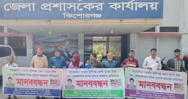 কিশোরগঞ্জ প্রতিবেদকঃ মুন্সিগঞ্জের সাংবাদিক হুজাইফার উপর সন্ত্রাসীদের হামলার প্রতিবাদে মানববন্ধন করা হয়েছে। সোমবার দুপুর ১২ টায় কিশোরগঞ্জ জেলা প্রশাসকের কার্যালয়ের সামনে বাংলাদেশ মফস্বল সাংবাদিক ইউনিয়ন কিশোরগঞ্জ জেলা শাখা,