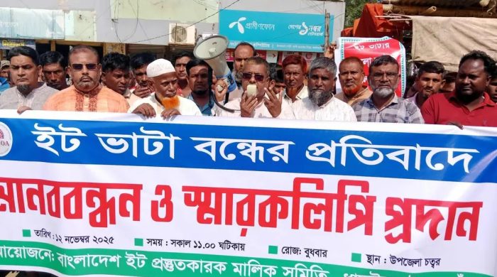 মোঃউজ্জল হোসেন ধামইরহাট (নওগাঁ) প্রতিনিধিঃ ধামইরহাটে ইট ভাটা বন্ধের প্রতিবাদে ১৬টি ইট ভাটার মালিক-শ্রমিকরা মানববন্ধন কর্মসূচি পালন করেছেন। ১২ নভেম্বর বুধবার দুপুরে উপজেলা পরিষদের সামনে অনুষ্ঠিত মানববন্ধন কর্মসূচি থেকে ভাটা