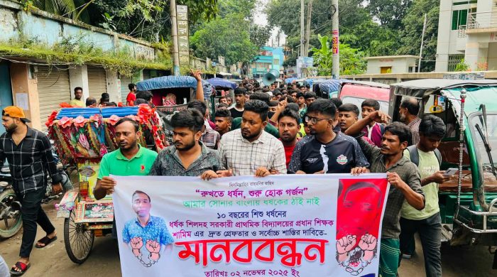 ফিরোজ শাহ, ইসলামপুর, জামালপুর: জামালপুরের ইসলামপুর উপজেলার গুঠাইল বাজারে ১০ বছরের এক কিশোরীকে ধর্ষণের অভিযোগে শিলদহ সরকারি প্রাথমিক বিদ্যালয়ের প্রধান শিক্ষক শামীমের দ্রুত গ্রেফতার ও সর্বোচ্চ শাস্তির দাবিতে মানববন্ধন অনুষ্ঠিত
