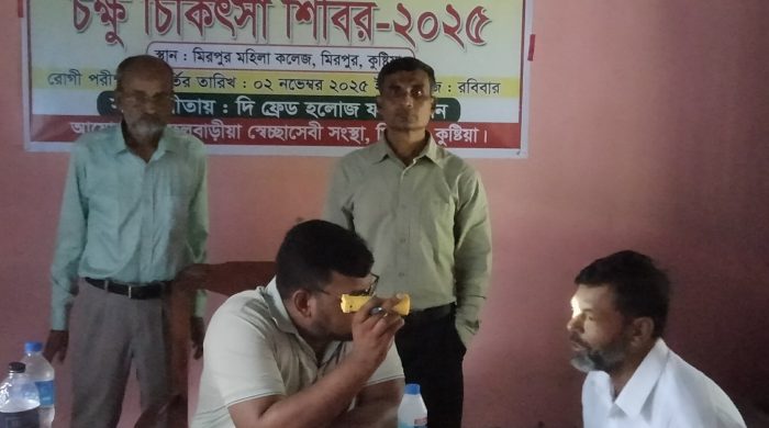 রাশেদুজ্জামান রিমন, কুষ্টিয়া কুষ্টিয়ার মিরপুরে হাজী ওয়াহেদ আলীর স্মরণে ফুলবাড়ীয়া স্বেচ্ছাসেবী সংস্থা ও খুলনা বিএনএসবি চক্ষু হাসপাতালের যৌথ উদ্যোগে এবং দি ফ্রেড হলোজ ফাউন্ডেশনের সহযোগিতায় “অন্ধ জনে দেহ আলো ”শ্লোগানে