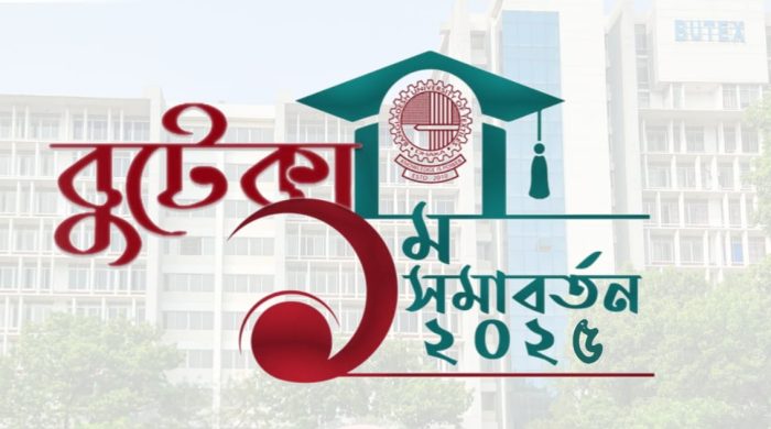 সুব্রত কুমার পাল,বুটেক্স প্রতিনিধি বাংলাদেশ টেক্সটাইল বিশ্ববিদ্যালয়ের(বুটেক্স) প্রথম সমাবর্তন অনুষ্ঠিত হতে যাচ্ছে আগামী ২৭ ডিসেম্বর(শনিবার)। অনুষ্ঠানটি বিশ্ববিদ্যালয়ের একাডেমিক যাত্রায় একটি নতুন মাইলফলক হিসেবে যুক্ত হবে। সমাবর্তন অনুষ্ঠান বিশ্ববিদ্যালয়ের ক্যাম্পাস প্রাঙ্গনে