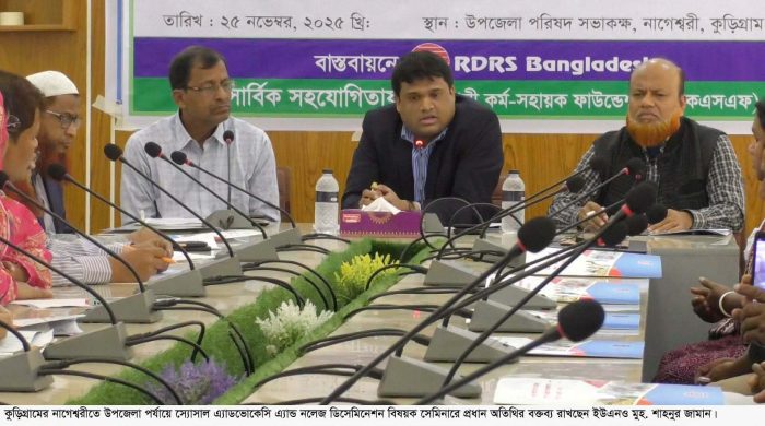 নূর-ই-আলম সিদ্দিক,কুড়িগ্রাম: কুড়িগ্রামের নাগেশ্বরীতে উপজেলা পর্যায়ে স্যোসাল এ্যাডভোকেসি এ্যান্ড নলেজ ডিসেমিনেশন বিষয়ক সেমিনার অনুষ্ঠিত হয়েছে। তারুণ্যের উৎসব২০২৫ উদযাপন উপলক্ষে আরডি আরএস বাংলাদেশ এর সমৃদ্ধি কর্মসূচির আওতায় পল্লী কর্ম সহায়ক