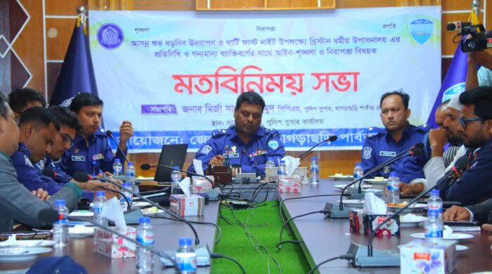 মোঃমাসুদ রানা, বিশেষ প্রতিনিধিঃ আসন্ন শুভ বড়দিন এবং থার্টি ফার্স্ট নাইট উদযাপন উপলক্ষ্যে খাগড়াছড়ি জেলা পুলিশের এক বিশেষ নিরাপত্তা বিষয়ক মতবিনিময় সভা অনুষ্ঠিত হয়েছে। রবিবার ২১শে ডিসেম্বর দুপুরে জেলা পুলিশ