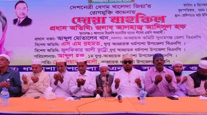 মো: ইমাম হোসেন হাওরাঞ্চল প্রতিনিধি, নেত্রকোনা- সুনামগঞ্জ সুনামগঞ্জের ধর্মপাশা উপজেলা সদরের উকিলপাড়া হেলিপ্যাড মাঠে বৃহস্পতিবার বিকালে ৪টায় বিএনপির চেয়ারপারসন ও সাবেক প্রধানমন্ত্রী খালেদা জিয়ার রোগমুক্তি কামনা করে দোয়া মাহফিল অনুষ্ঠিত