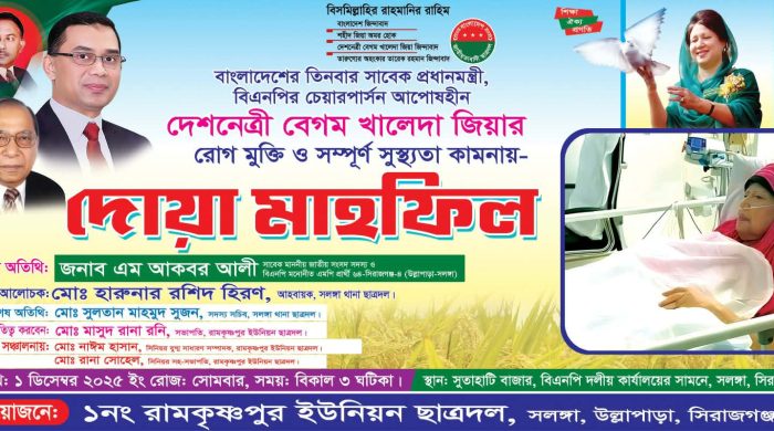 মোঃ আখতার হোসেন হিরন : সিরাজগঞ্জের সলঙ্গায় ১নং রামকৃষ্ণপুর ইউনিয়ন ছাত্রদলের উদ্যোগে বাংলাদেশ জাতীয়তাবাদী দল বিএনপি চেয়ারপারসন ও তিনবারের সফল সাবেক প্রধানমন্ত্রী বেগম খালেদা জিয়ার রোগ মুক্তি কামনায় গতকাল সোমবার read more